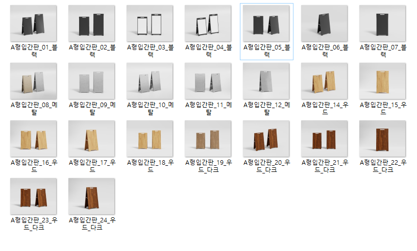 - a형 입간판 텍스쳐만 변경하여 렌더링 (블랙, 메탈실버, 우드_라이트, 우드_다크)