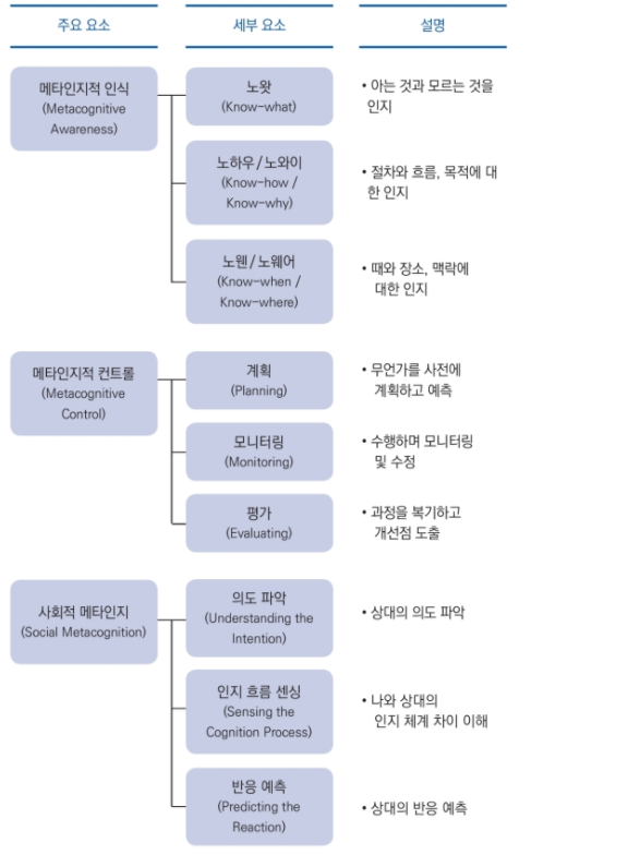 업무 현장에서 의미가 있는 내용을 쉽게 설명하면 다음의 세 가지 하위 개념이 메타인지적 인식을 핵심적으로 설명한다.