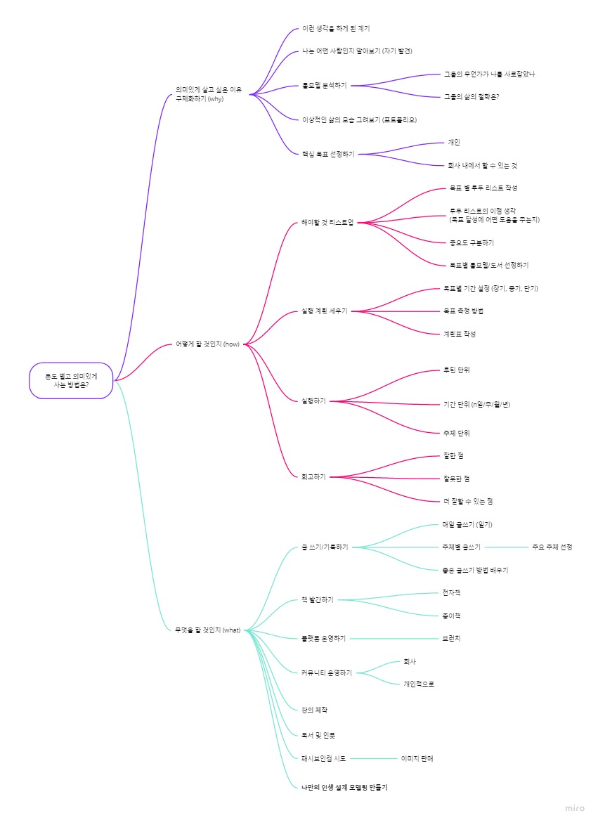 물론 이러한 방법이 꼭 정답은 아니다. 하지만 나도 나만의 인생 설계 모델링을 만들고 싶은 니즈가 있기 때문에 다른 사람들이 만든 모델링을 체험하면서 그들은 어떤 목적으로 이러한 설계를 했고 무엇을 얻을 수 있는지 파악해보는 것은 좋은 경험이라고 생각한다. 그리고 경험에 그치는 것이 아니라 부족한 점과 더 보완하면 좋은 점을 발견하여 나만의 모델링에 첨가를 해야겠다. 이들은 밥상을 차려준 것이지 무엇을 먹고 건강해질지는 내 손과 쥐고 있는 숟가락, 젓가락에 따라 달려있다. 새우 알레르기가 있다면 새우를 먹을 필요는 없으니.
