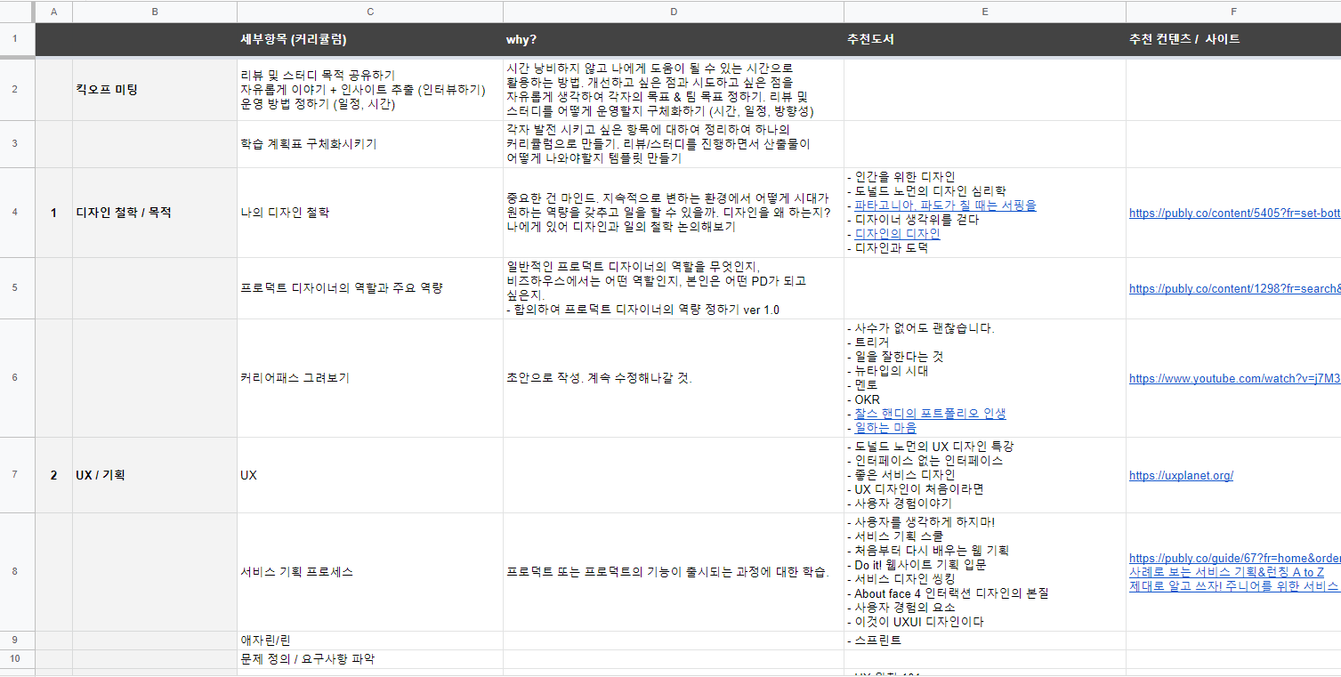 프로덕트 디자이너 팀의 리더가 되면서 어차피 해야한다면 시간을 의미있게 보내자고 다짐하고 스터디 계획을 세웠다. 22.1.5. 오늘이 킥오프 미팅이었다. 사전에 공유했던 스터디의 목적과 방식, 학습 주제에 관하여 같이 이야기를 나누었다. 사전에 why, how, what을 중심으로 스터디 플랜을 고민하고 계획해두었기 때문에 막막하지는 않았던 것 같다. 하지만 커뮤니케이션 스킬이 부족해서 조금 버벅였던 것 같다. 말을 잘 하고 싶다. 이건 계속 연습할 수밖에 없는 것 같다. 여하튼 사전에 세운 계획은 아래에 첨부했다.