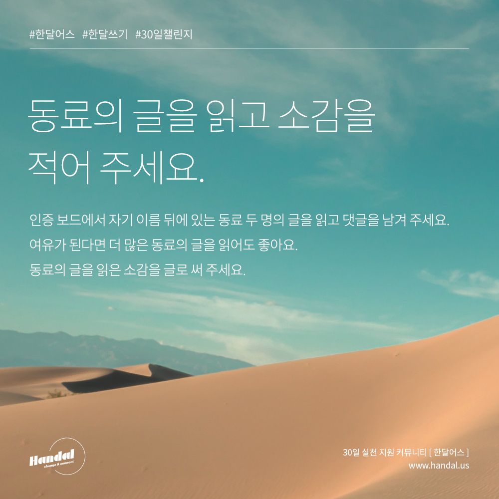 사실 글을 쓰는 목적이 내 생각을 적어보면서 나를 더 알아가자는 것도 있었지만 나와 비슷한 사람들, 같은 프로젝트를 진행하고 있는 사람들에게서 그들은 어떤 고민을 하고 선택했는지 많은 것을 얻어가자는 것도 있었다. 그러나 돌이켜보면 너무 내 글을 쓰고 인증하는 것에만 급급했던 것 같다는 생각을 했다. 글을 쓰고 인증을 하면 거의 자정이 되었기 때문에 피곤하다는 이유로 다른 분들의 글을 깊게 보지 않고 있었다.