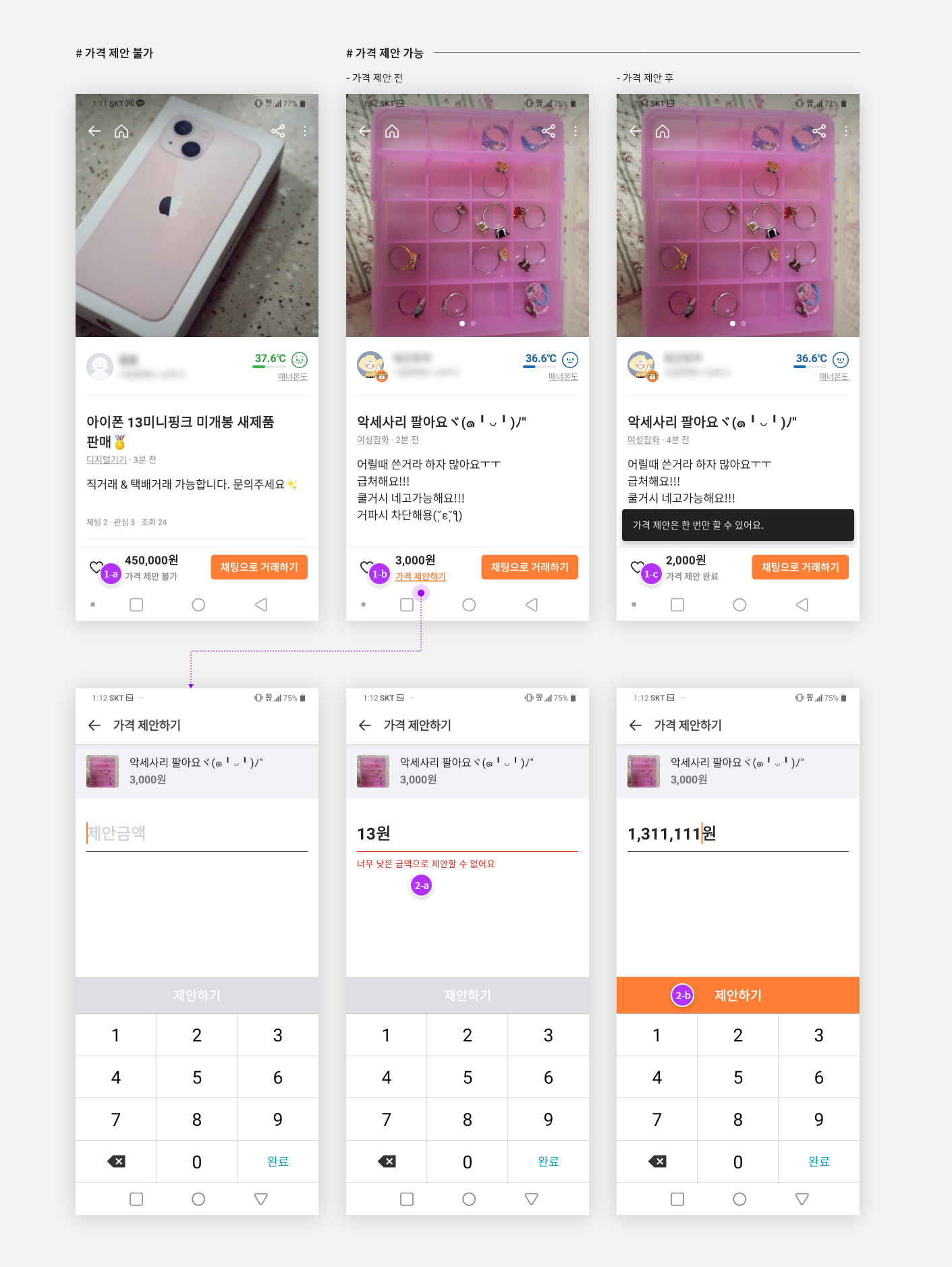 - ⓒ 가격 제안 완료 -> 클릭시 토스트 팝업 뜸 '가격 제안은 한 번만 할 수 있어요.'