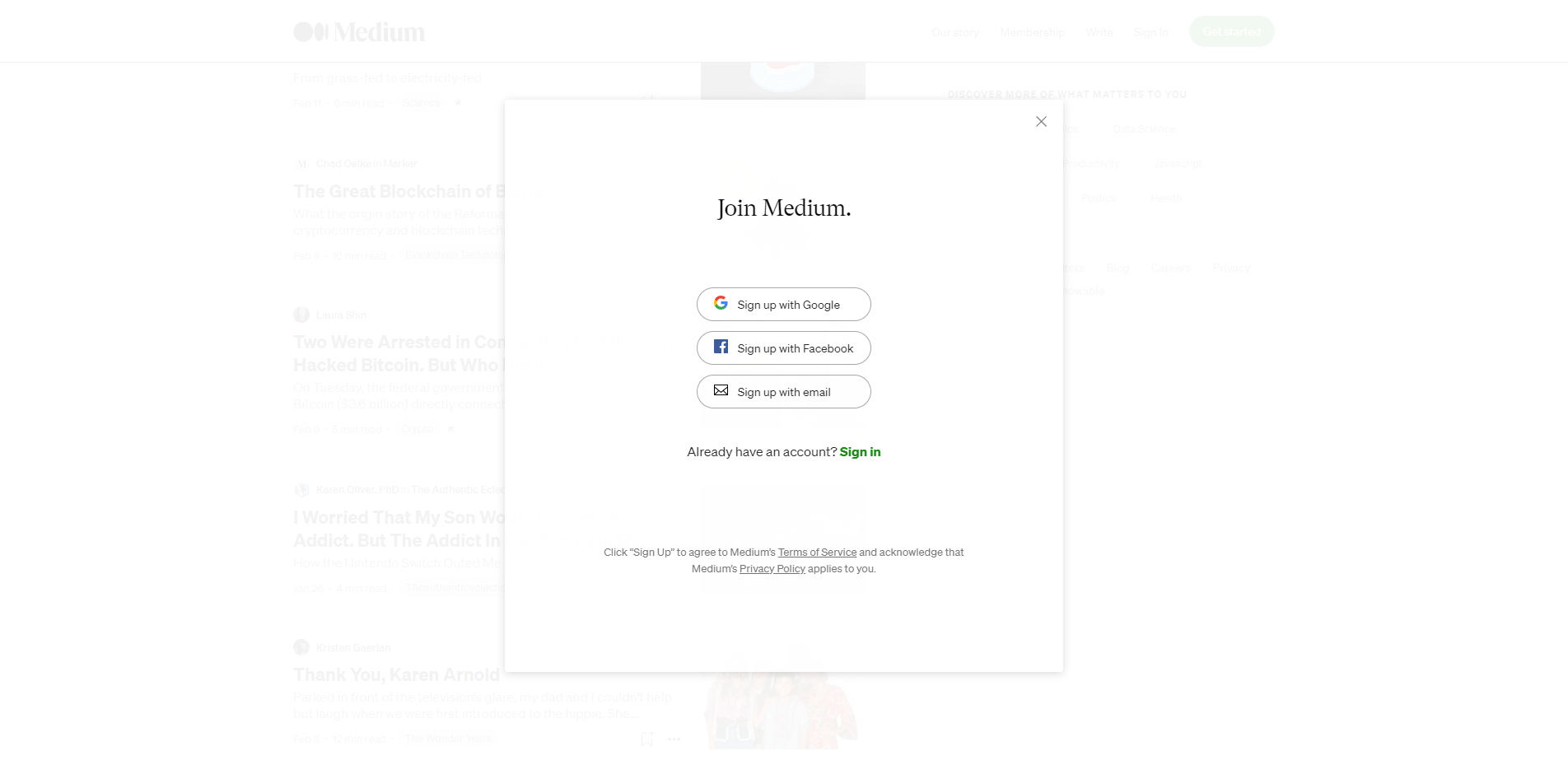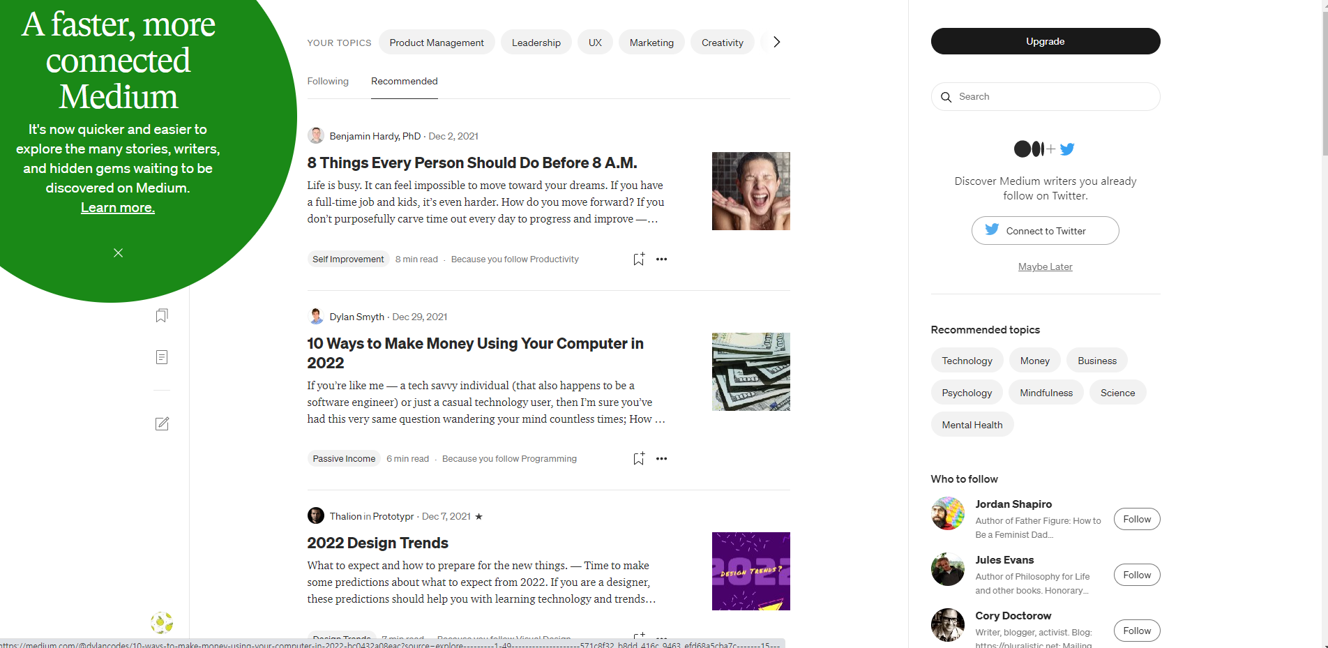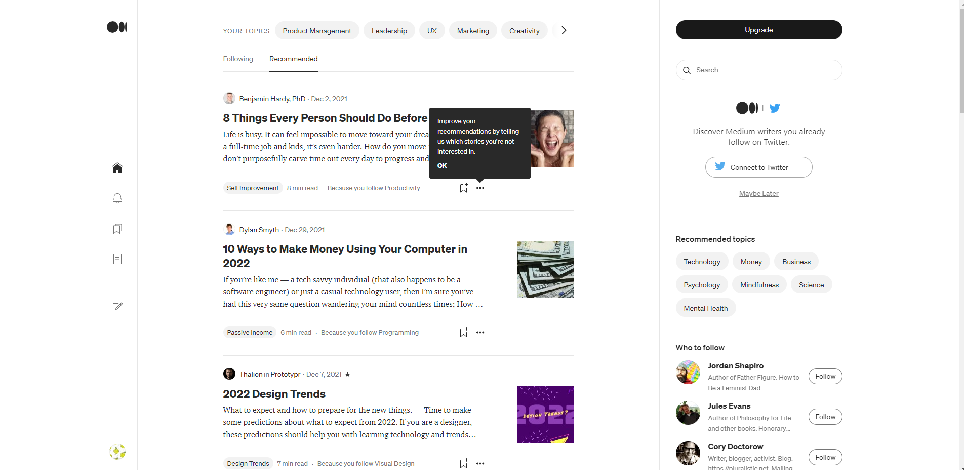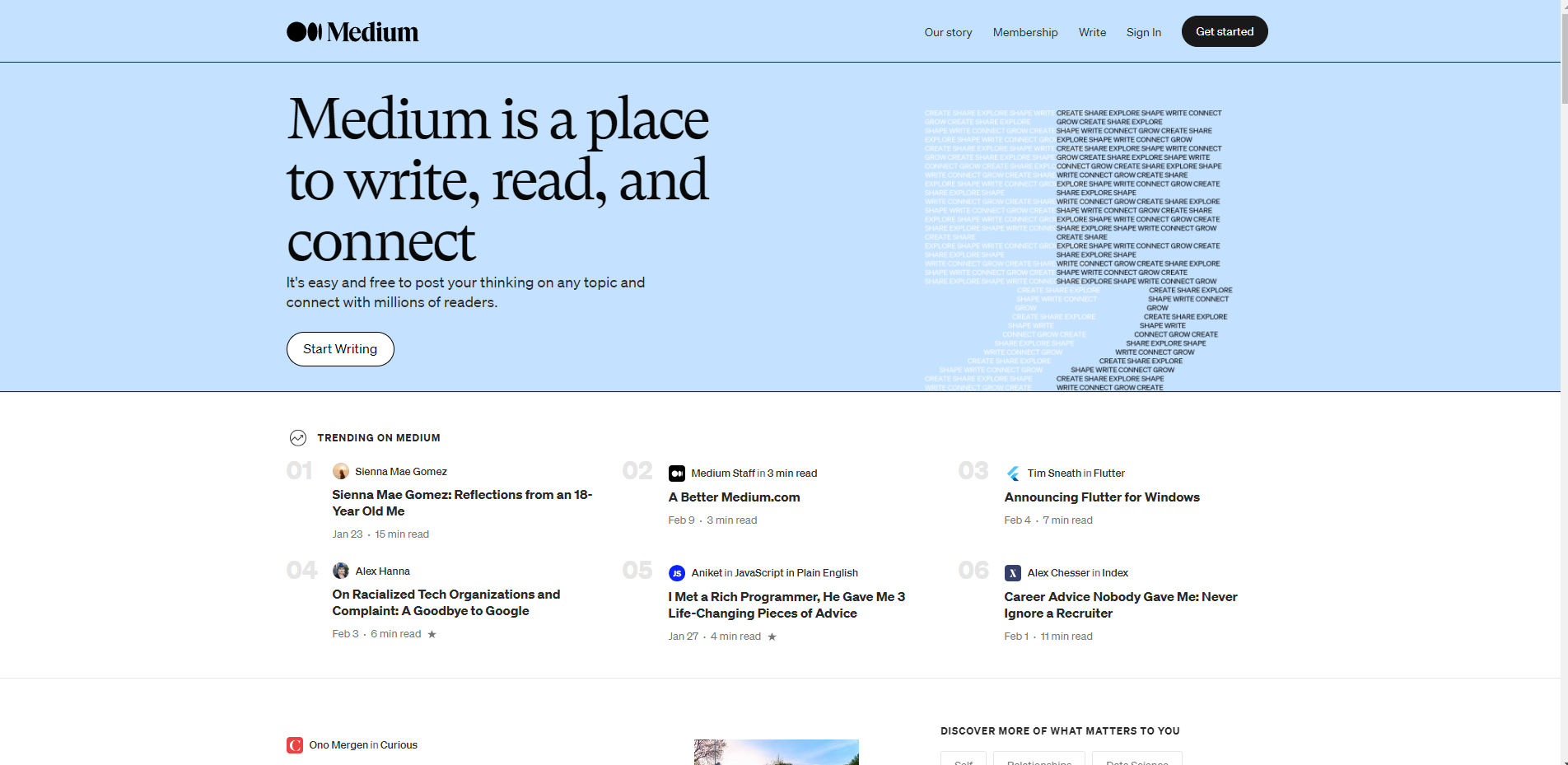 - Trending on medium으로 인기 목록을 소개해준다.