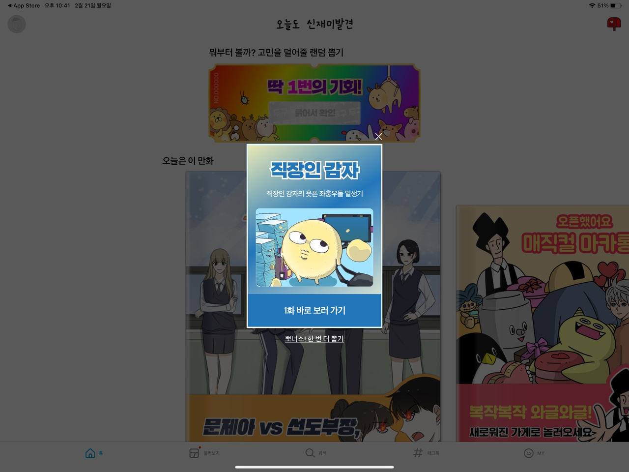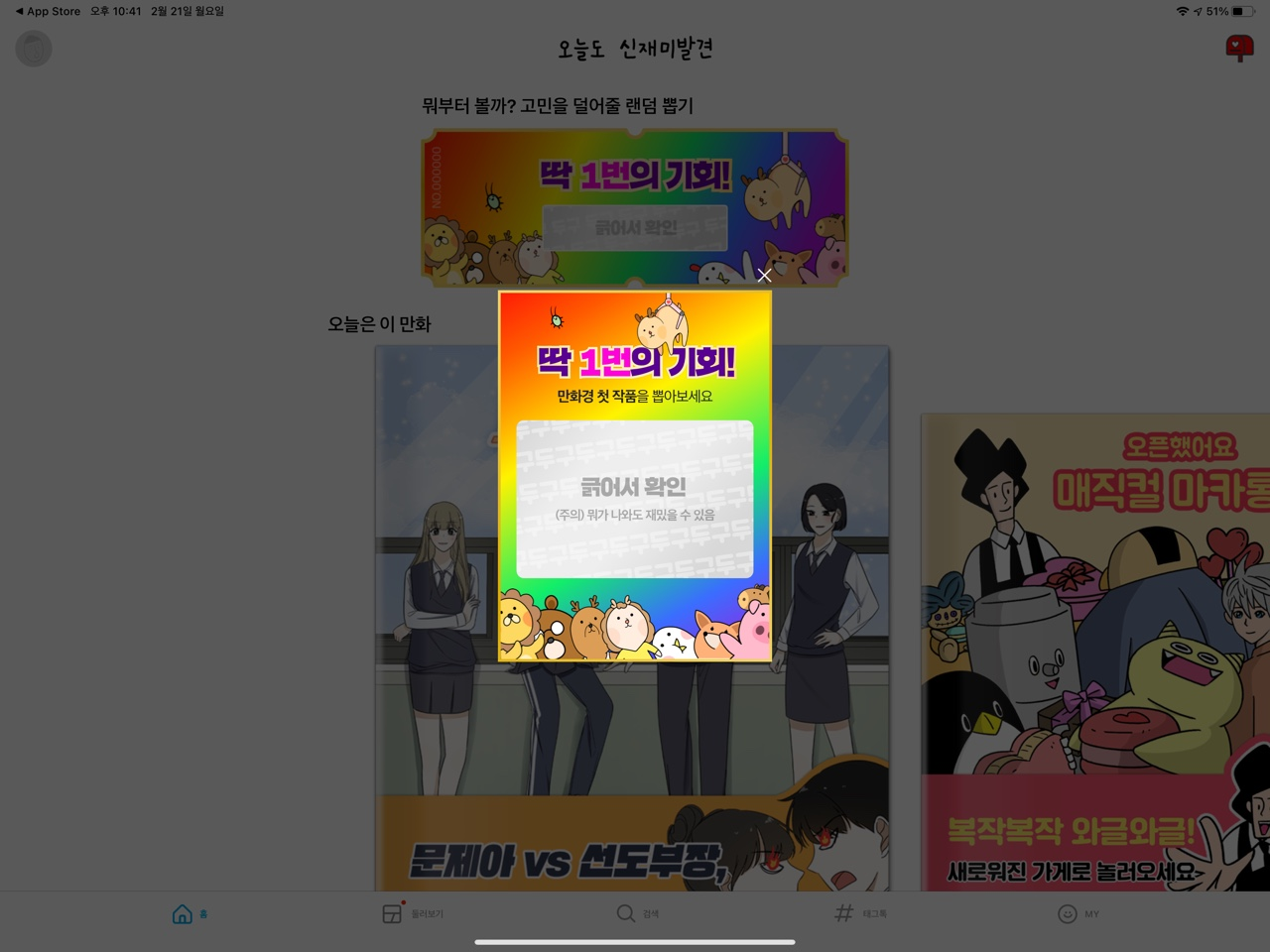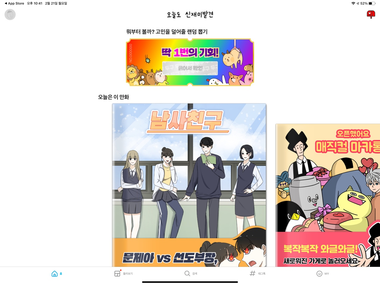 - 복권처럼 긁으면 웹툰이 1개 추천되고 다시 뽑기 기능으로 여러번 긁을 수 있다.