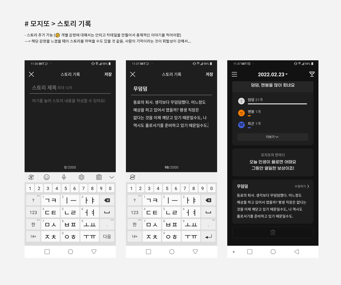 - 스토리 추가 가능 (🤔 개별 감정에 대해서는 안되고 칵테일을 만들어서 총체적인 이야기를 적어야함)