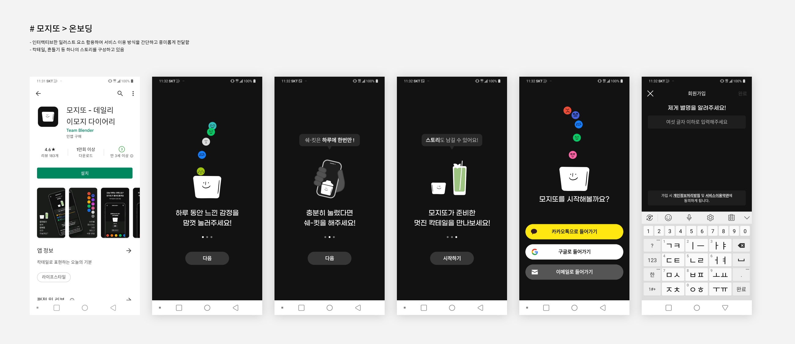 - 인터렉티브한 일러스트 요소 활용하여 서비스 이용 방식을 간단하고 흥미롭게 전달함