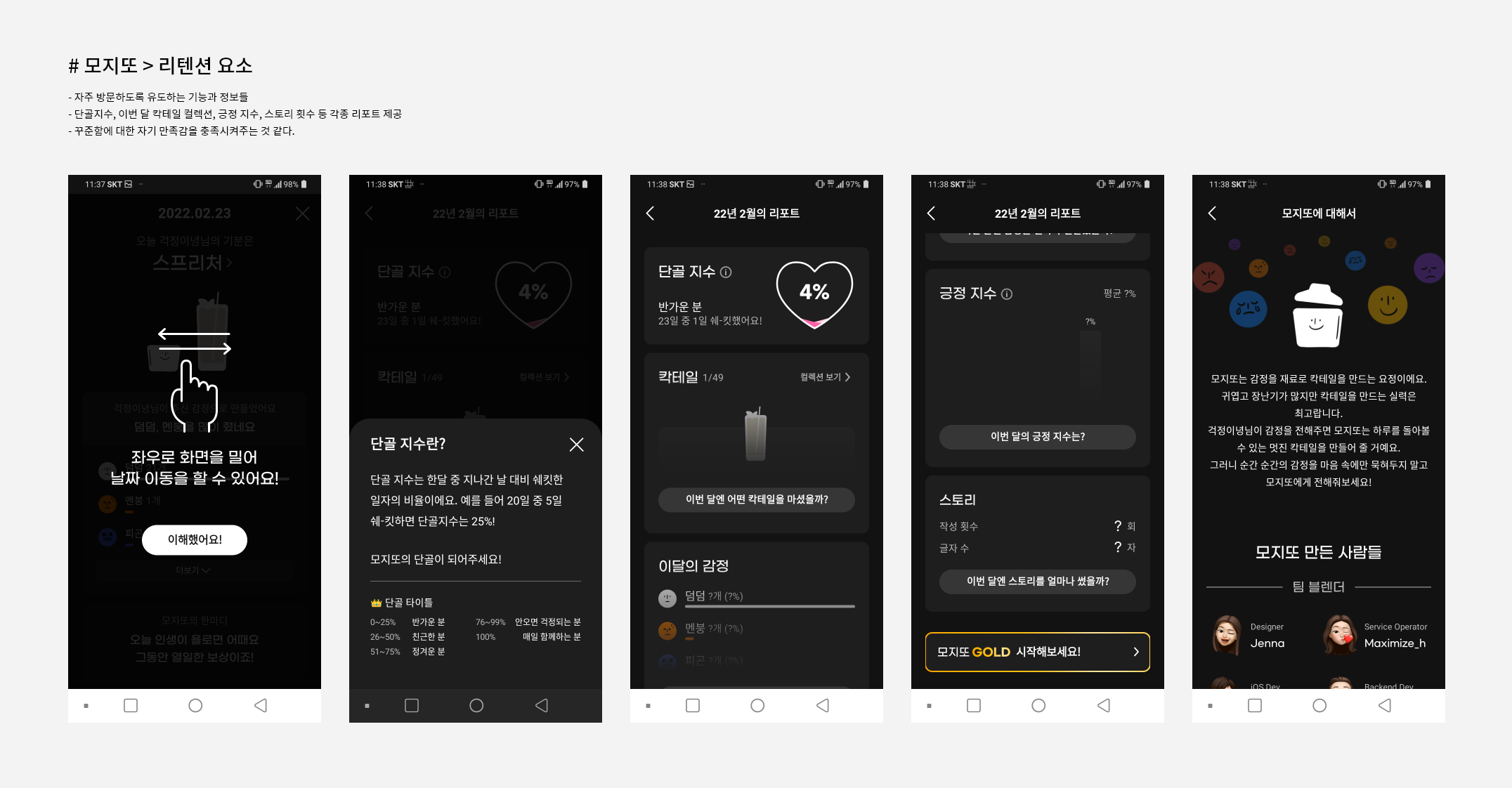 - 단골지수, 이번 달 칵테일 컬렉션, 긍정 지수, 스토리 횟수 등 각종 리포트 제공