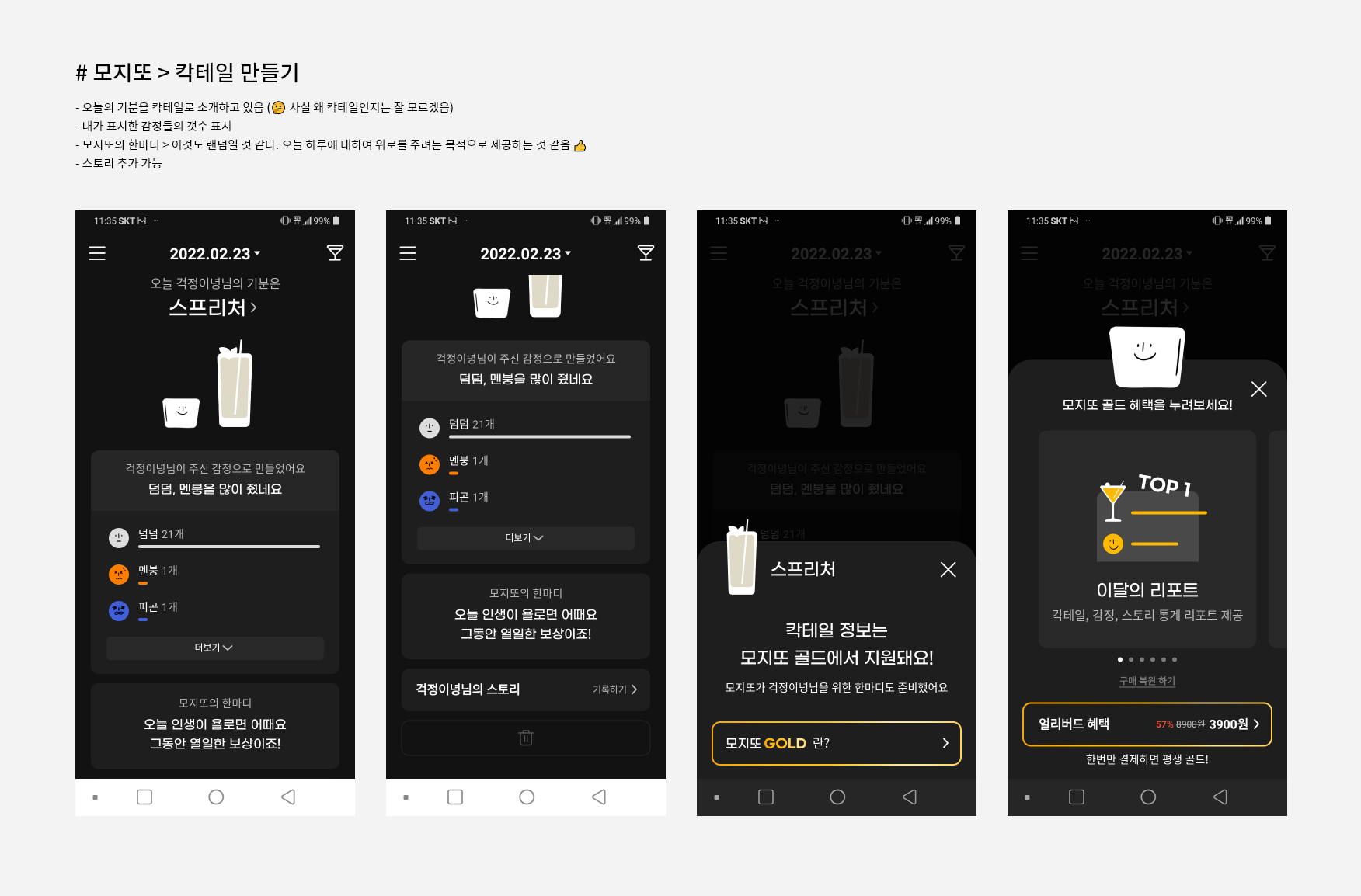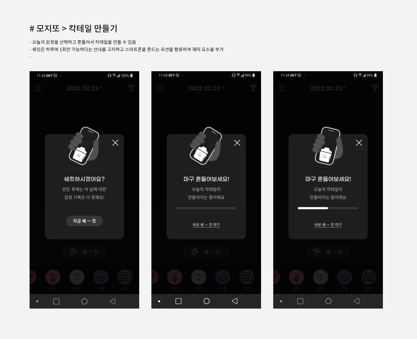 - 오늘의 감정을 선택하고 흔들어서 칵테일을 만들 수 있음