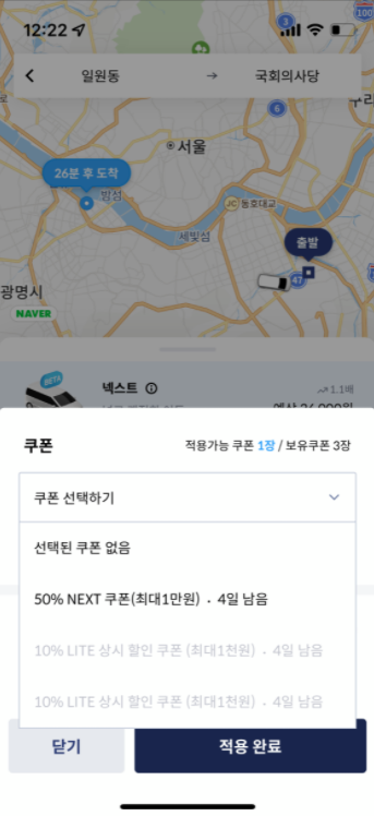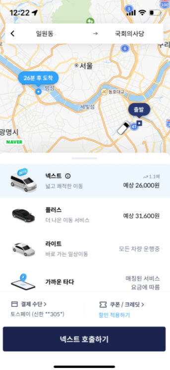 | 👍 출발 위치와 도착지에 도착하는 시간을 확실히 인지할 수 있음 😰 넥스트, 플러스, 라이트 등 차량 이름이 어떤 서비스를 제공하는지 잘 이해되지 않음 😰 넥스트의 1.1배는 무엇? |