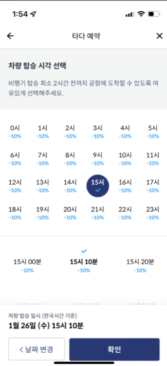| 😰 시간 선택이 꽤 복잡해보인다. 시간을 선택하고 아래에서 분을 선택하게 되어있음. 최선이었을까.. 😰 시간에 10% 할인, 10분 단위로 10% 할인디 다 붙어있어서 ui가 복잡해보인다. 시간에 할인이 붙으면 10분 단위는 당연히 붙는 것이 아닌지. |