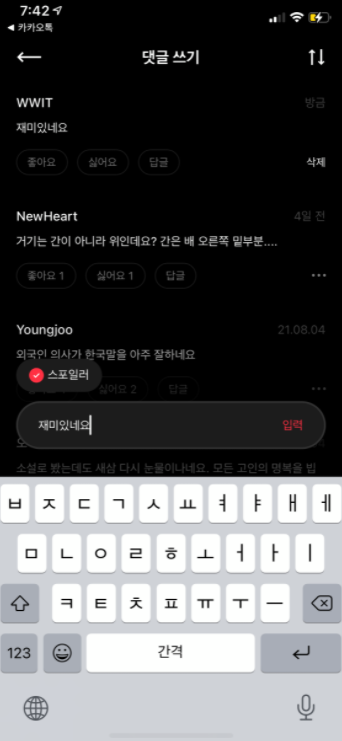 1. 스포일러 체크 기능 - 댓글 작성시 스토리에 영향을 줄 수 있는 부분이 있으면 가릴 수 있는 기능 - 유저의 판단에 맡겨야 한다는 부분에서 완벽하지 않을 수는 있지만 없는 것 보다는 도움 될 듯 |