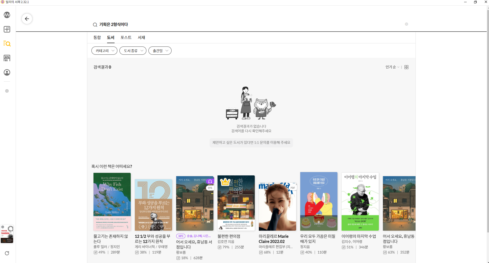 1. 1:1 문의 안내 - 검색 결과가 없을 때 1:1 문의를 통해서 제안하라는 안내가 나온다 - 안내를 하면서 바로 1:1 문의하는 방법으로 연결을 시켜주었으면 좋았을 것 같다. - 1:1 문의를 어떻게 하는지 의문이 들고 서비스를 이것저것 눌러보면서 탐색을 해야한다. - 고객의 맥락을 고려하여 안내 전/후로 플로우를 단축시켜줄 수 있는 ux가 더 필요할 듯 💬 이렇게 개선해보기 - '도서 제안하기' 버튼을 추가하며 바로 1:1 문의를 할 수 있도록 팝업이라 링크를 연결시킨다. --- 2. 연관없는 책추천 - 단순히 검색결과 없음을 표시하지 않고 하단에 책을 추천해주고 있다. - 하지만 검색한 키워드와 관련이 없는 책이라서 별로 관심이 가지 않는다. - 어떤 기준인지도 모르겠음. 💬 이렇게 개선해보기 - 검색한 키워드의 내용을 포함하고 있는 유사한 책 추천 - 어떤 기준의 책인지 인지할 수 있도록 정보 안내 (ex. 새로나온 책, n주간 베스트셀러 등) |