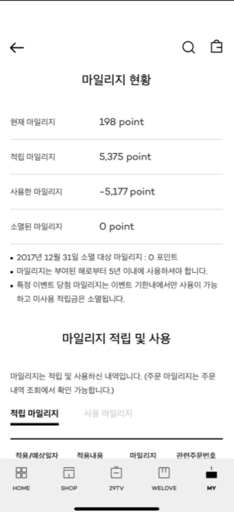 1. 가장 중요한 것은 현재 사용할 수 있는 마일리지이므로 사용한 마일리지나 소멸된 것과 정보 강조를 다르게 해서 보여주면 좋을 듯 - hierarchy 고려가 잘 안되어 있는 것 같다. |