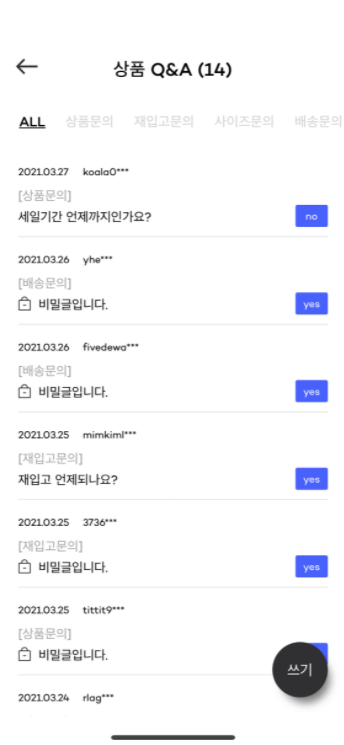 1. Q&A대한 답변 상태가 우측 no, yes 라벨로 표시되고 있는 것 같음 - 더 직관적으로 no일때 회색을 사용하거나해서 yes와 차이를 두었으면 좋을 것 같다. |