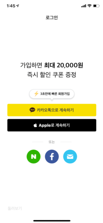 1. 보통은 로그인 화면에서 이메일 가입 vs sns 리스트 이렇게 나누는데 강조하는 sns를 위에 두고 이메일을 나머지 sns와 합쳐서 표현한 것이 새로웠다. 구조화에 대해서 내가 조금 틀에 박힌 생각을 하고 있었던 것 같다. |