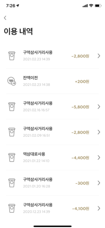 1. 위와 동일하게 아이콘으로 상태 구분 | 1. 사용과 충전을 더 구분하기 쉽게 했으면 좋았을 듯. 지금은 +/-로 구분할 수 있으나 색상을 달리 표시했다면 더 직관적이었을 것ㄱ ㅏㅌ다. |