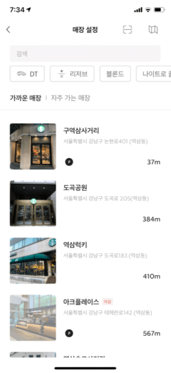 1. 마감 상태 표시 - 라벨 및 썸네일을 살짝 흐릿하게 하여 정상 운영되고 있는 매장과 구분을 주었음 2. 가까운 매장 > 현재 위치에서 거리 표시되는 것 좋음 |
