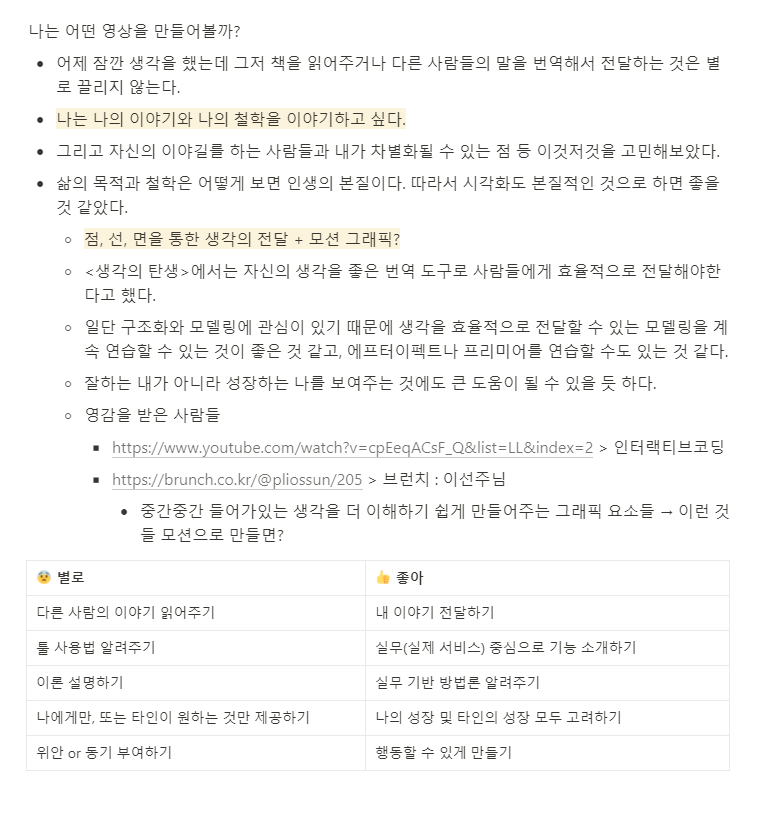 생각을 어떤 번역도구를 사용하여 효율적으로 전달할지는 가장 큰 고민이다. 구구절절 설명하기에는 제대로 전달이 되지 않을 것 같다. 무엇이든지 본질이 중요하기 때문에 시각화도 본질에 집중을 해보기로 했다. 점, 선, 면을 기반으로 모션 그래픽을 통한 전달. 비주얼이 약하기는 하지만 잘하는 내가 아니라 성장하는 나를 보여주고 싶은 것이기 때문에 오히려 더 괜찮은 것 같다. 꾸준히 했을 때 또 어느정도 나아질 수 있을지 새로운 도전이다.
