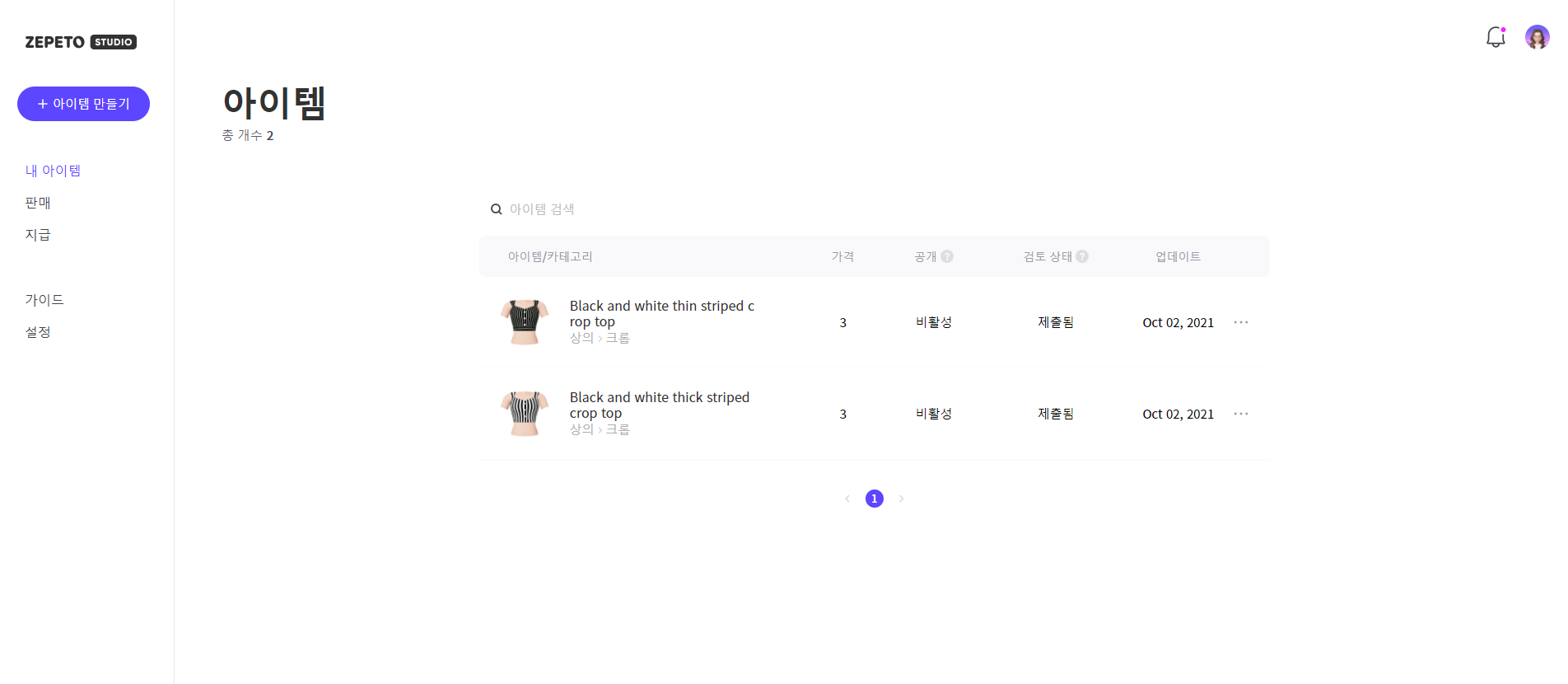 이렇게 두개의 줄무늬 아이템을 판매하게 되었다. 너무 간단하게 만들었고 기본템이라서 왠지 보류 당할 것 같지만 새로운 시도를 해본 것에 의의를 두겠다! 생각보다 재미있었다. 다음에는 3D 모델링까지 해서 판매하는 것에 도전해봐야겠다. 😁