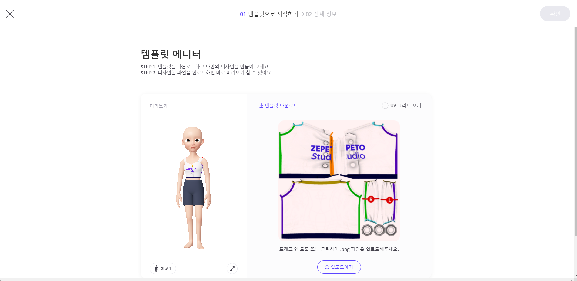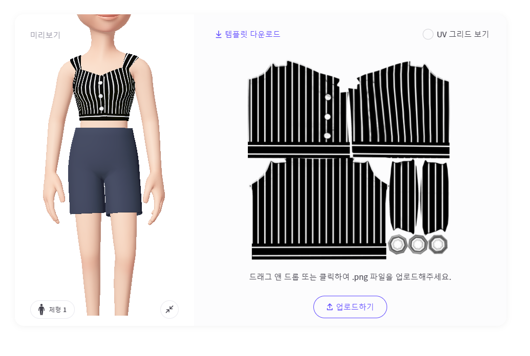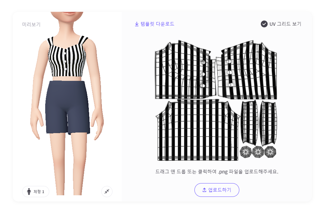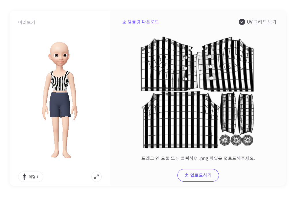 원하는 의류를 선택하면 이렇게 캐릭터에 입혀진 모습과 UV 그리드를 확인할 수 있다. 상단에 '템플릿 다운로드'를 클릭하여 템플릿을 다운로드 받으면 포토샵 파일을 열 수 있다.