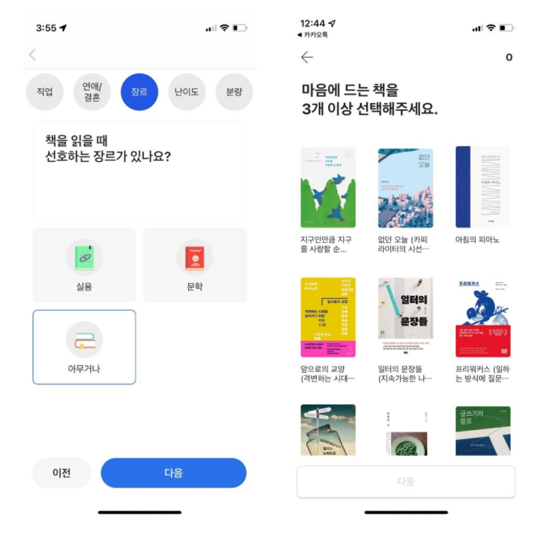 - 특히 마음에 드는 책을 선택해달라고 하는 것은 해당 책을 읽어보지 못하면 선택할 수 없는 항목이다. 이 세상에는 수천만권의 책이 있는데 장르나 카테고리 구분도 아니고 한 권의 책을 몇권 보여주고 선택하라는 것이 이상하게 느껴졌다. 저 중에 모두를 읽어본 사람이 과연 있을까.