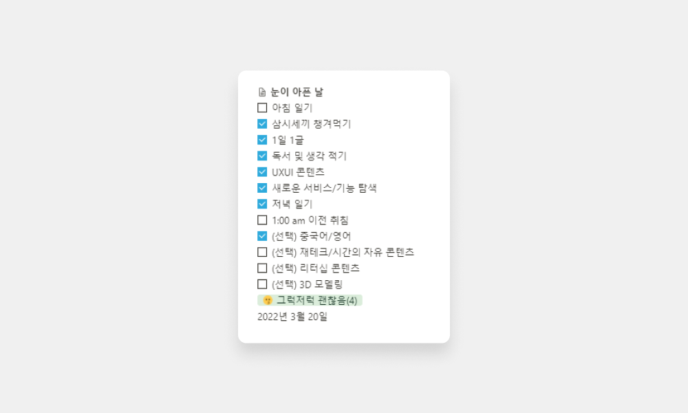 어제 오늘 노션에 to-be 포트폴리오 템플릿을 거의 정리를 하고 루틴 기록도 노션으로 시작했다. 그런데 사실 노션은 개인 페이지의 성향이 강한 것 같아서 티스토리를 버리기가 많이 아쉽다. 조금씩 늘어나는 방문자수도 나름의 동기 부여가 되었기 때문에. 그래서 노션에 기록하고 다시 티스토리에도 복붙하는 작업을 하고 있었는데 너무 쓸데없는 일을 하는 걸까 고민도 됐다. 같은 작업을 2번 반복하니까. 깔끔하게 복붙이 되면 좋겠지만 그것도 아니라서 각 섹션마다 다시 글과 이미지를 복붙하는 루틴한 작업을 반복하고 있었다. 아직 잘 모르겠으니까 조금 확답이 나올 때까지는 일단 냅둬볼까...