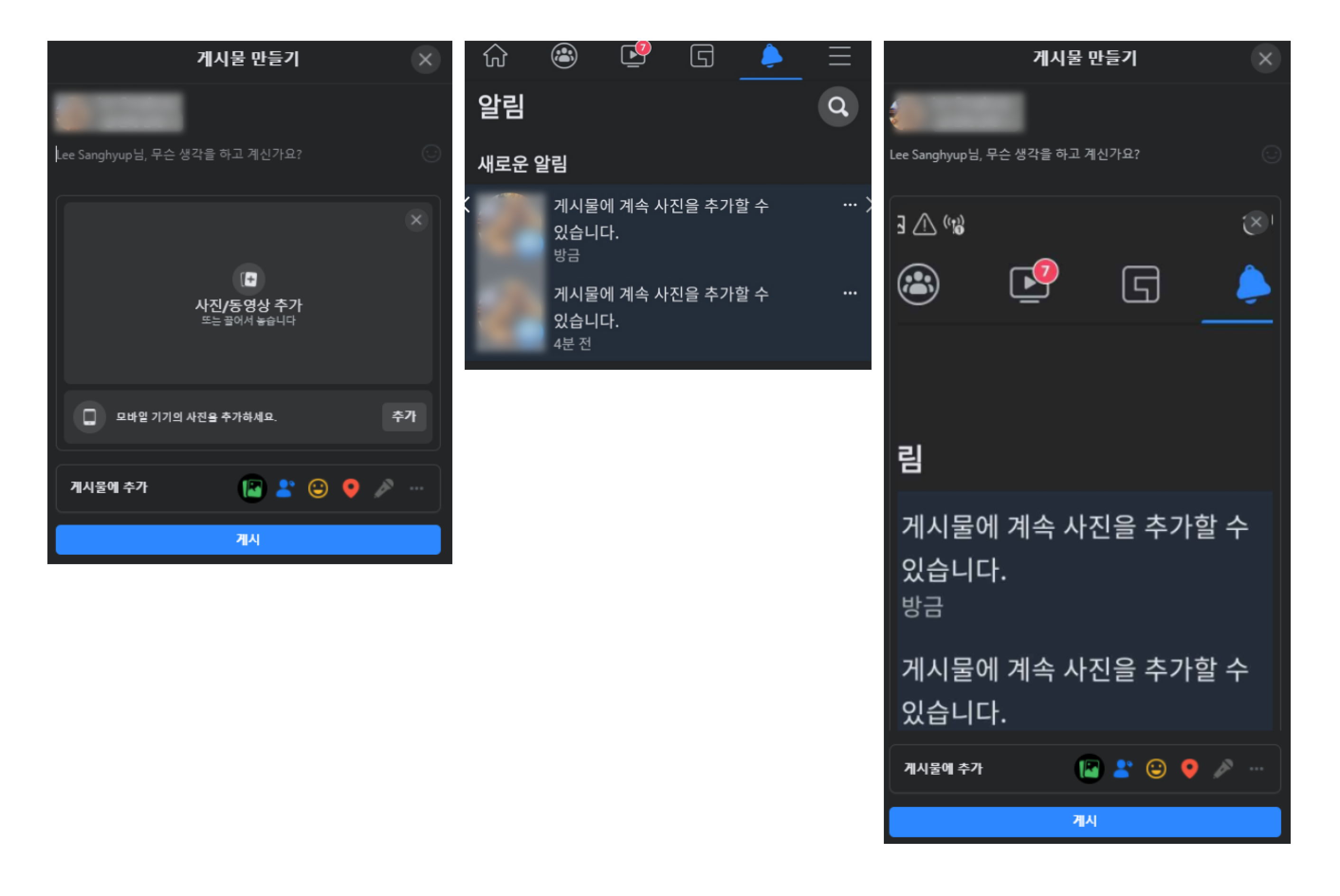 - 페이스북에서는 ‘모바일 기기의 사진을 추가하세요’라는 섹션을 별도로 추가하여 클릭시 모바일로 사진 추가 알림을 제공함.