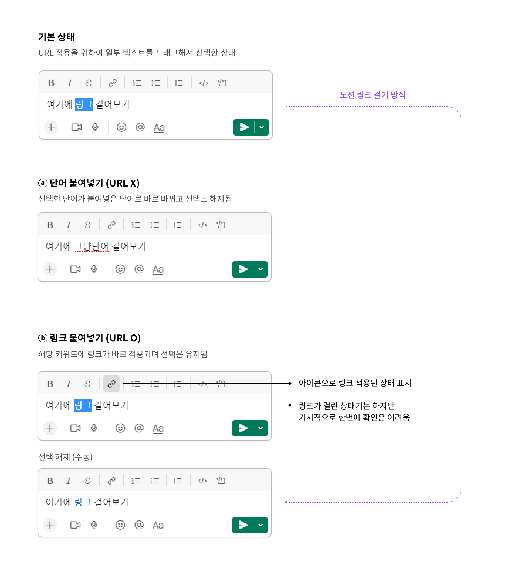 - 슬랙은 링크 적용시 바로 선택이 해제되며 링크가 적용된 텍스트가 확실하게 보임.