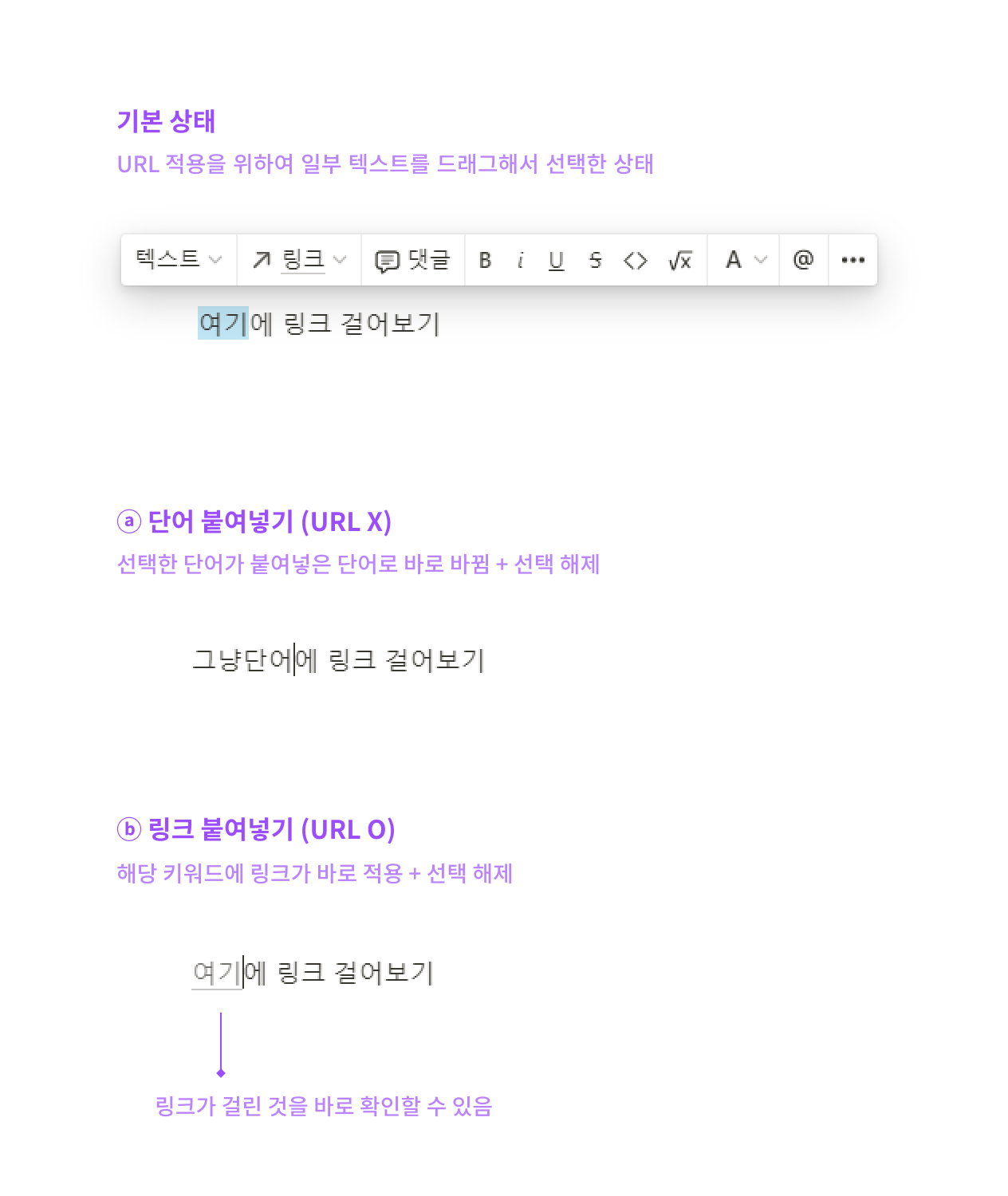 - 노션은 그저 텍스트 드래그 후 ctrl+v를 하면 바로 링크가 걸린다. → 매우 편했음 (심지어 링크걸기도 바로 위에 나옴)