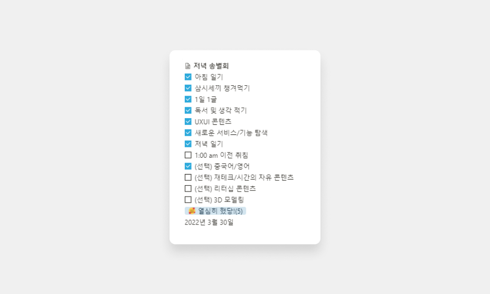 - 오늘은 술을 마실 예정이라서 루틴을 많이 못할 줄 알았는데 아침 출근하는 시간에 틈틈이 일기와 콘텐츠를 보기도 했고 지금 자기 전에 남은 루틴을 진행하고 있어서 상당 부분 체크하고 잘 수 있을 것 같다.