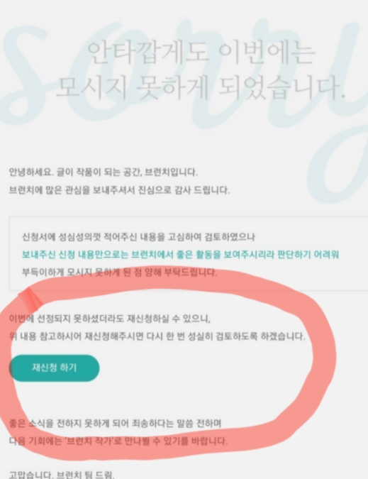 - 작가 신청에 탈락했더라도 그저 탈락 안내만 하는 것이 아니라 안내한 사항을 보충하여 다시 신청하라도 유도함