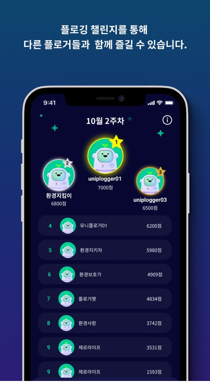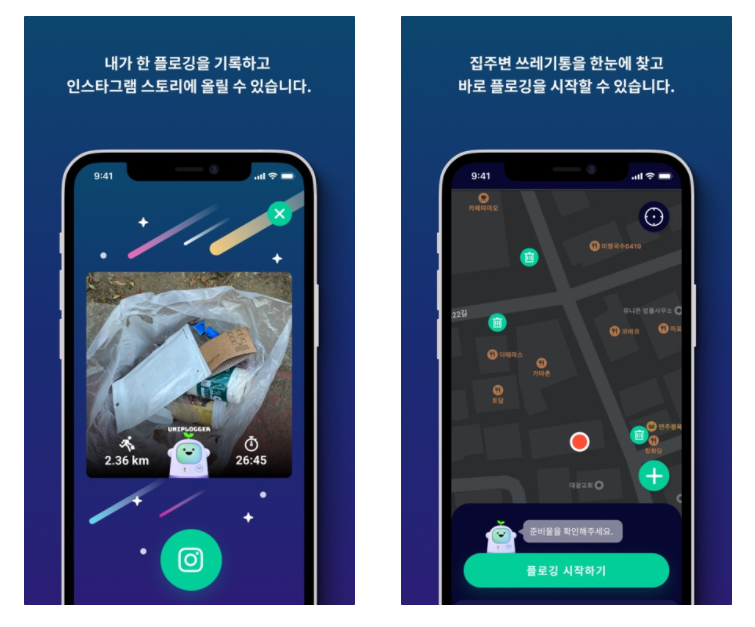- 로그 & 리더보드: 개인의 플로깅 기록을 확인하고 랭킹화해서 더 활동을 하도록 유도