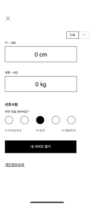 - 신체 사이즈 입력 받고 내 신체에 맞는 사이즈 추천해줌