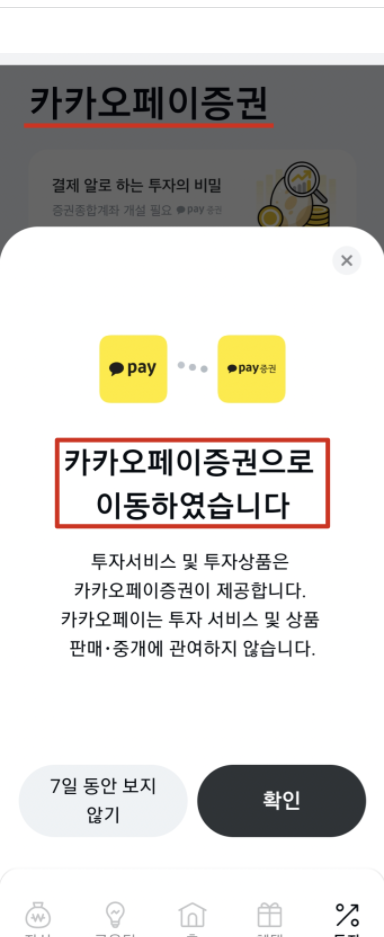 - 투자 선택시 카카오페이증권으로 이동되었다는 확실한 안내
