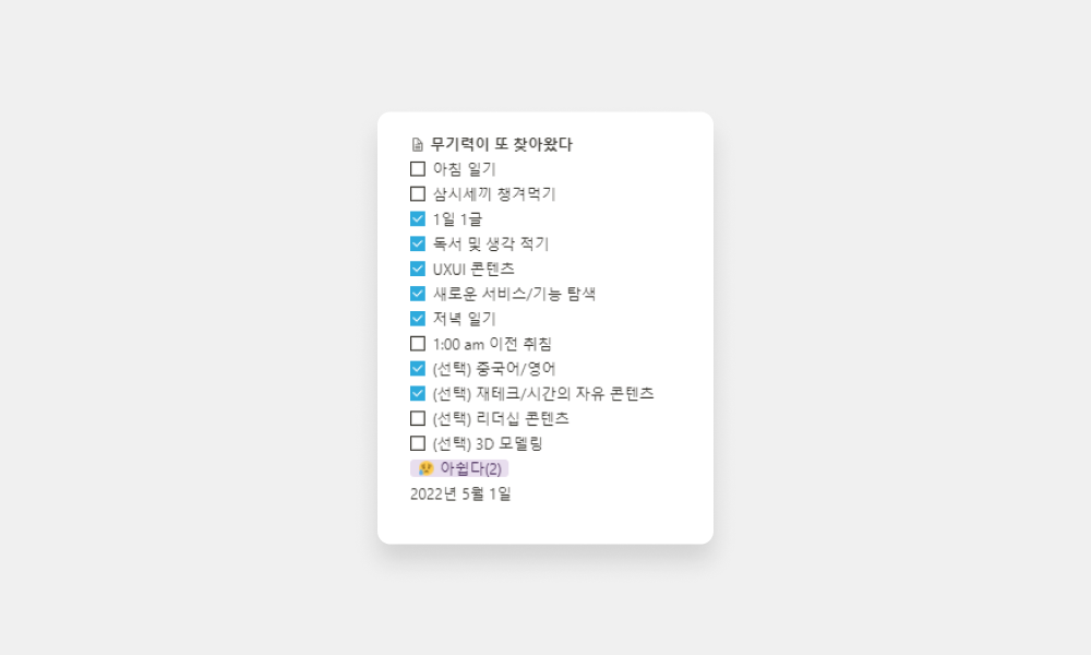 - 정말 귀찮고 무기력한 날이지만 오늘도 기본 습관을 위해서 이렇게 일기를 쓰고 있는 것.