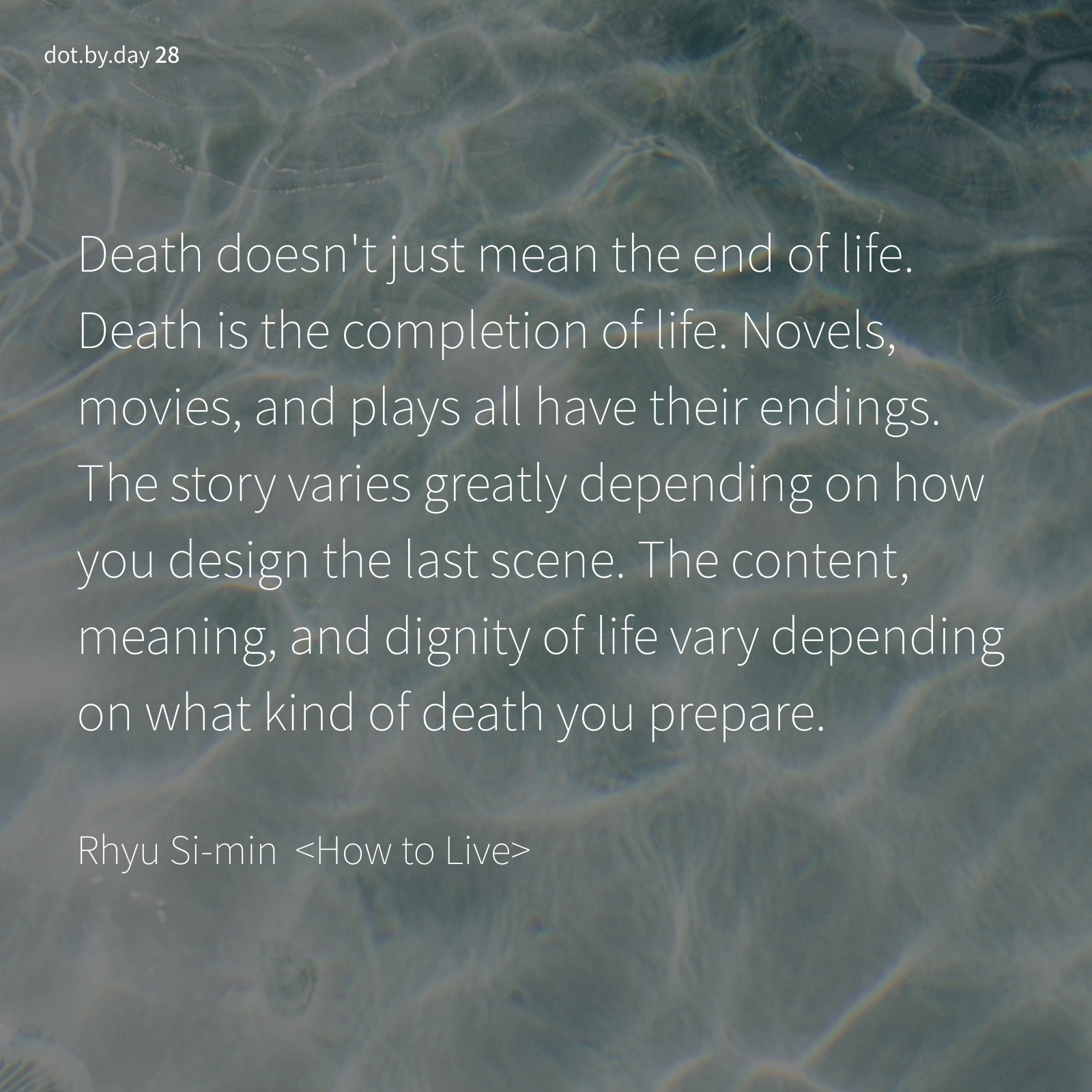 사실 언제 죽을지 모른다. 기대수명이 늘어났다고 하나 내일 당장 사고로 죽을 수도 있다. 몇 년 뒤에 병으로 죽을 수도 있고. 여전히 죽음을 생각하면 무섭기만 하다. 그러나 곰곰이 생각해보면 예전에는 죽음이 무서운 이유는 생이 끝나는 것 자체는 아니라 그저 아플 것 같아서였다. 추가로는 부모님이 슬퍼할까 봐서. 아직은 죽음의 가치를 점점 늘리고 있는 과정이기는 한데, 죽는다는 것이 단순히 육체적인 고통이 아니라 나의 가능성을 펼칠 수 있는 시간이 줄어들어서 아쉽다고 느낄 수 있는 경지가 되었으면 좋겠다.