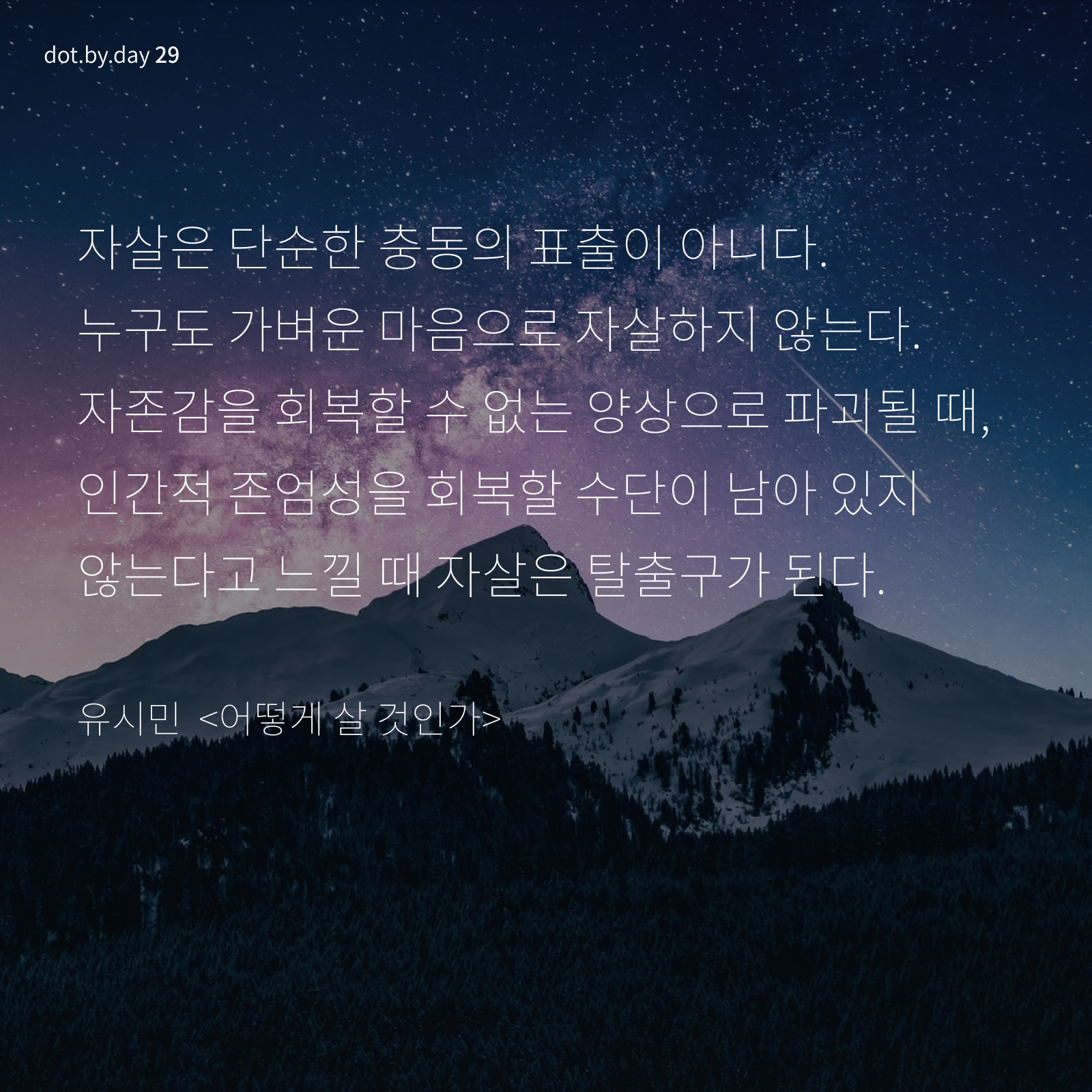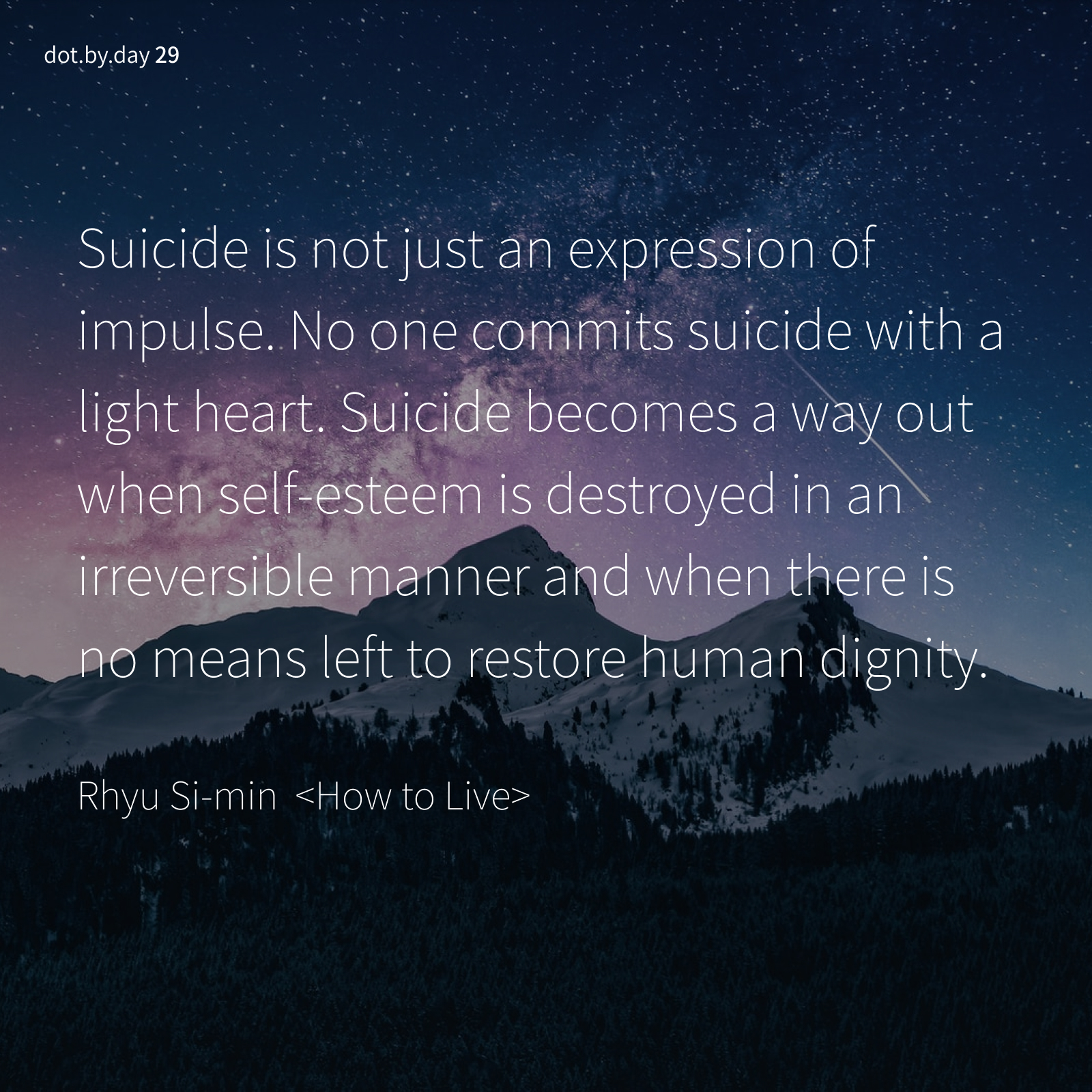 살면서 자살을 생각해보지 않은 사람은 없다. 당연히 사람마다 고민의 깊이는 다를 것이다. 누군가는 그저 ‘죽음’이라는 것을 생각해볼 뿐이고, 다른 누군가는 진지하게 자신의 삶을 끝낼 방법을 생각을 해볼 수도 있다. 생각과 행동은 큰 차이가 있다. 실제로 행동을 하는 것은 더 큰 용기를 필요로 한다. 육체적인 고통이나 남아있는 가족의 슬픔, 또는 앞으로 남은 인생에 대한 가능성에 대한 생각 등. 그 모든 것을 생각하더라고 죽는 것이 고통에서 벗어날 수 있는 유일한 방법이라고 생각한다면 두려움 속에서도 실행하게 되는 것 같다.