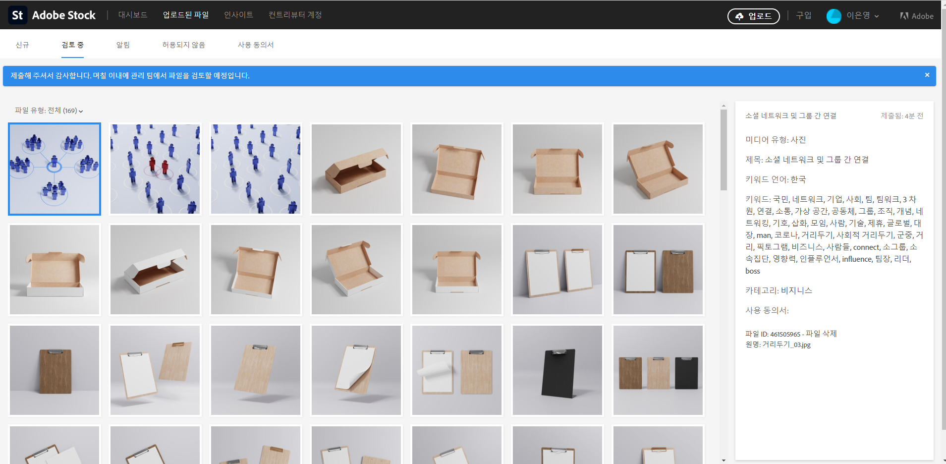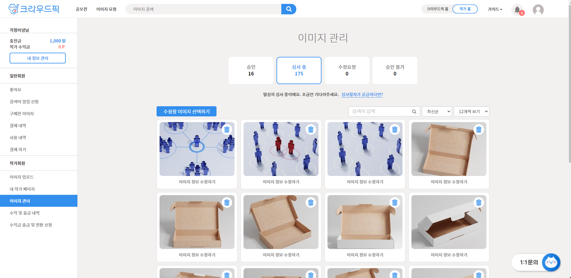 재택 근무를 끝내자마자 크라우드픽에 이미지를 등록했다. 원래 20개만 등록가능하고 20개가 검토 되어야 또 20개를 등록할 수 있는 줄 알았는데 그냥 한번에 요청하는 것이 20개고 계속 승인 신청을 할 수 있었다. 현재 16개 승인된 상태이고 오늘 175개 승인을 요청했다.