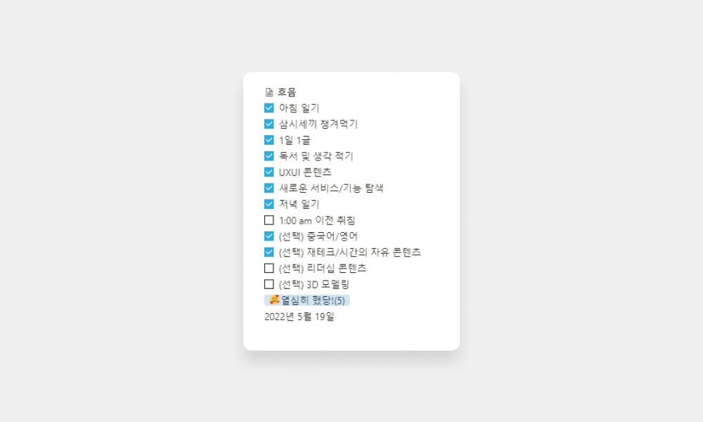 어제, 아니 오늘도 새벽 3시에 잠이 들었다..! 1일1글을 마무리하니까 3시가 되었다. 정말 새벽 1시 전에 취침하기는 없애던가 확실하게 지키던가 해야겠다. 달력 데이터베이스 아래에 체크리스트 데이터베이스를 추가해뒀는데 어제 잠깐 훑어보니 약 50일간 1시 전에 취침한 날이 1일 밖에 되지 않았다. 모두 성공한 것은 1일1글, 영어/중국어 공부였다. 뭐 처음부터 모든 것을 다 하려고 한 건 아니어서 심리적인 타격이 큰 것은 아니다. 오히려 하루도 빠지지 않고 진행한 루틴 항목도 있다는 것에 만족감이 생겼다. 여하든 올빼미족에서 아침형인간으로 다시 태어날 거라고 생각했으면 확실히 지킬 필요도 있을 것 같다.