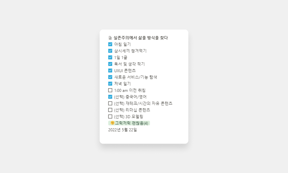 - 노션에 주간 액션 보드를 추가했다. 이번 주에 해야할 것도 to-do list로 작성을 해두었다. 좀 과하게 잡았나 싶기는 하지만 이번주 목, 금에 연차를 낼 생각이니 괜찮을 것 같기도 하다.