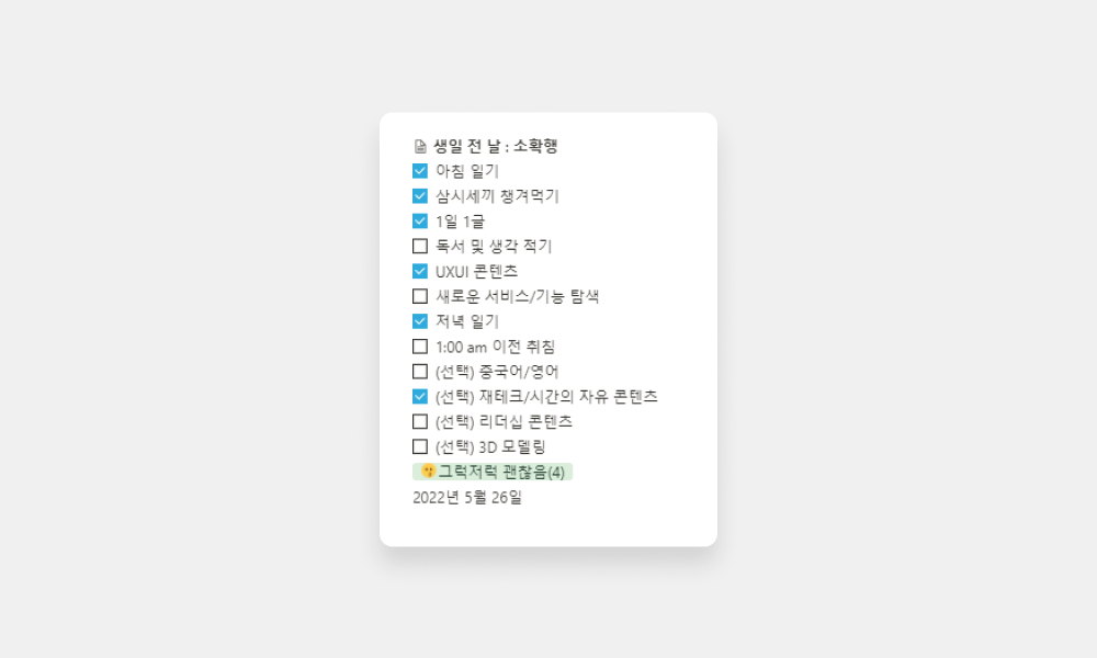 내일 내 생일 기념으로 나에게 휴가를 주었다. 놀고자 하는 것은 아니고 이번 주부터 주간 액션 대시보드를 추가했는데 지금까지 한 것이 하나도 없다 ㅜㅜ 이러면 굳이 계획을 세우는 행동이 무의미해지기 때문에 금요일과 주말을 합쳐서 이번 주 목표로 세운 것들을 최대한 이뤄볼 예정이다. 화이팅!!