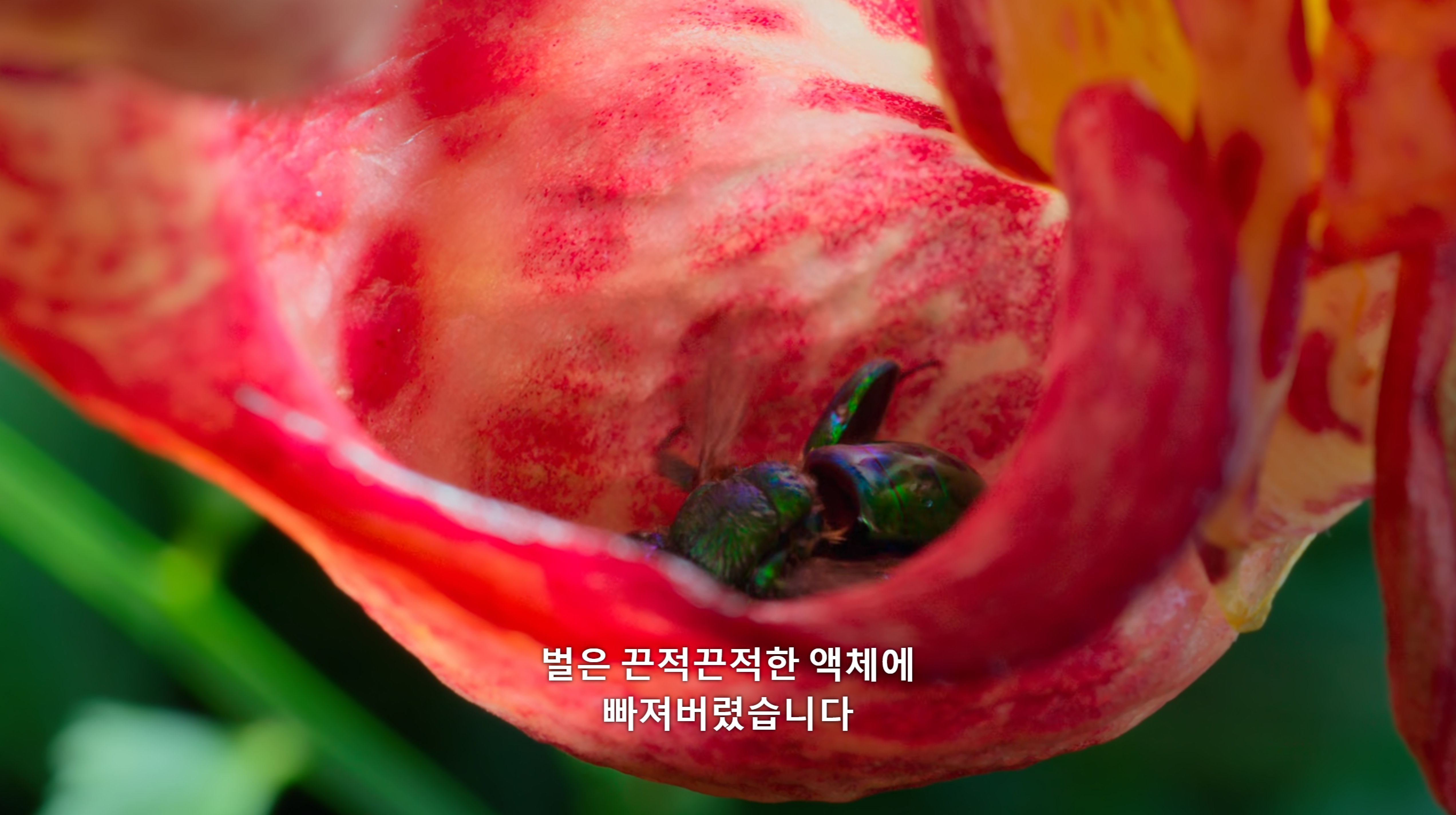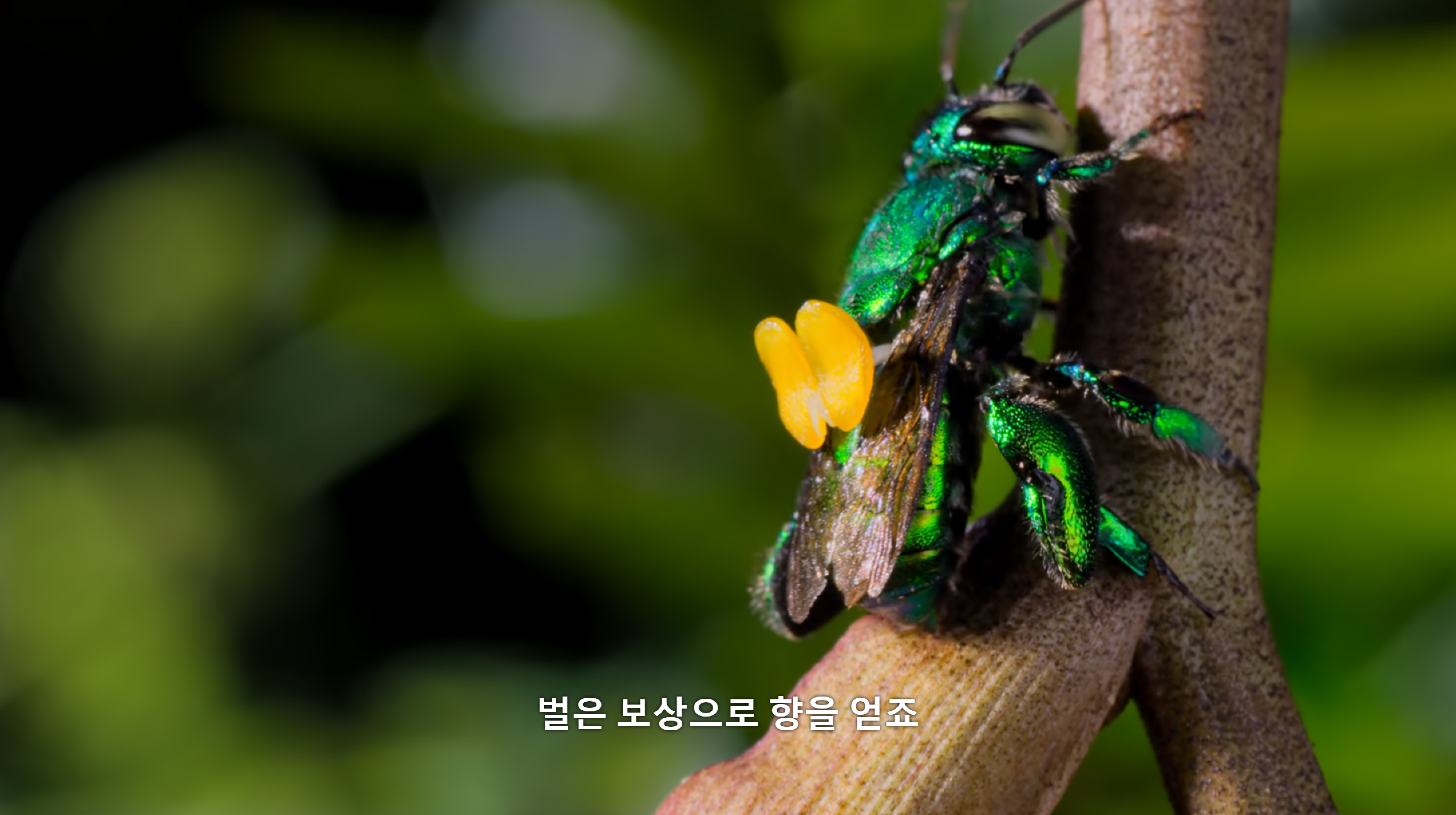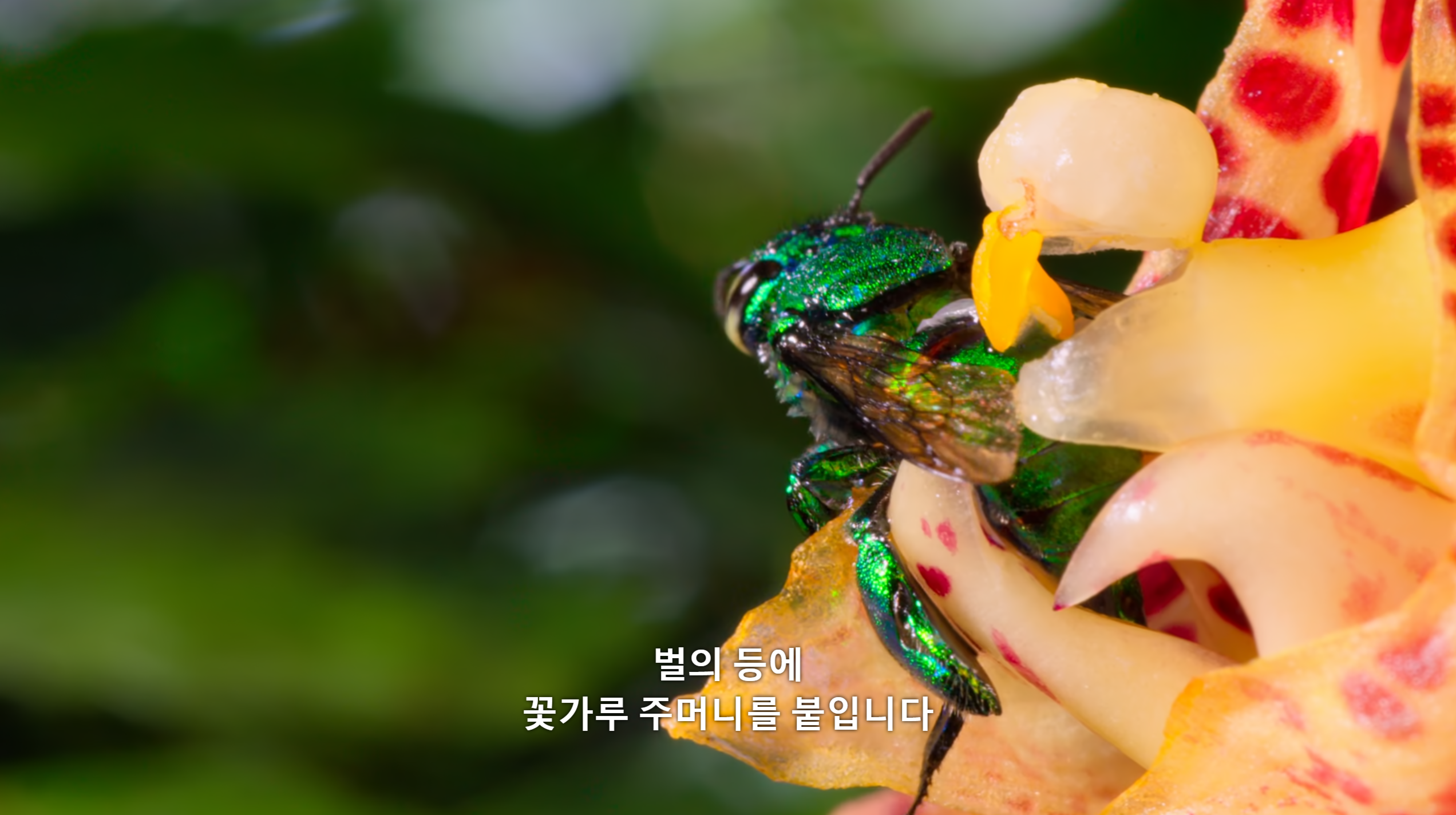 이 부분이 가장 신기했다. 벌이 빠진 구멍으로 빠져나올 수 없게 끈적이는 액체를 뿜고, 간신히 찾은 구멍을 빠져나오면 난초는 꽃가루를 붙여 다른 꽃으로 수정을 유도한다. 벌이 꿀을 모으면서 당연히 몸에 꽃가루를 붙인다는 것은 알고 있었는데, 저렇게 좁은 구멍에서 힘들게 나오고 난 후 등의 짝 중앙에 붙어있는 주머니를 보니 너무 신기했다. 대충 붙어있을 법도 한데 딱 조준을 한 것 마냥 달려있는 것이 자연의 신비인가 싶다.