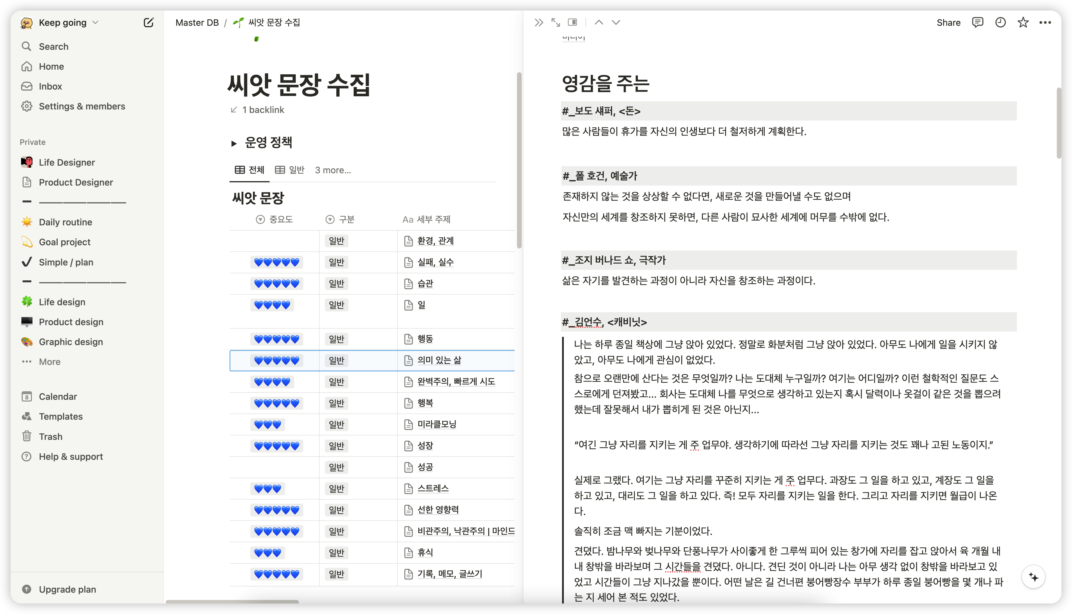 두 번째는 기록이다. 사람의 감정과 기억은 쉽게 휘발되기 때문에 나중에 생각날 것이라 자부하지 않고 세세한 것도 기록하는 것이 중요하다. 당장 어제 먹은 점심도 기억나지 않는 것이 사람이다. ‘제텔카스텐(Zettelkasten)’은 독일어로 “노트 상자”를 의미하며, 복잡한 정보와 아이디어를 체계적으로 정리하고 연결하기 위한 노트 작성 방법이다. 이 시스템을 접하기 전에도 기록의 중요성을 인지하고 기록해두고 있었다. 가장 효과적이었던 것은 책을 읽거나 다양한 아티클을 읽으며 좋은 생각이 이어졌던 문장들을 수집한 ‘씨앗 문장 수집’이다.