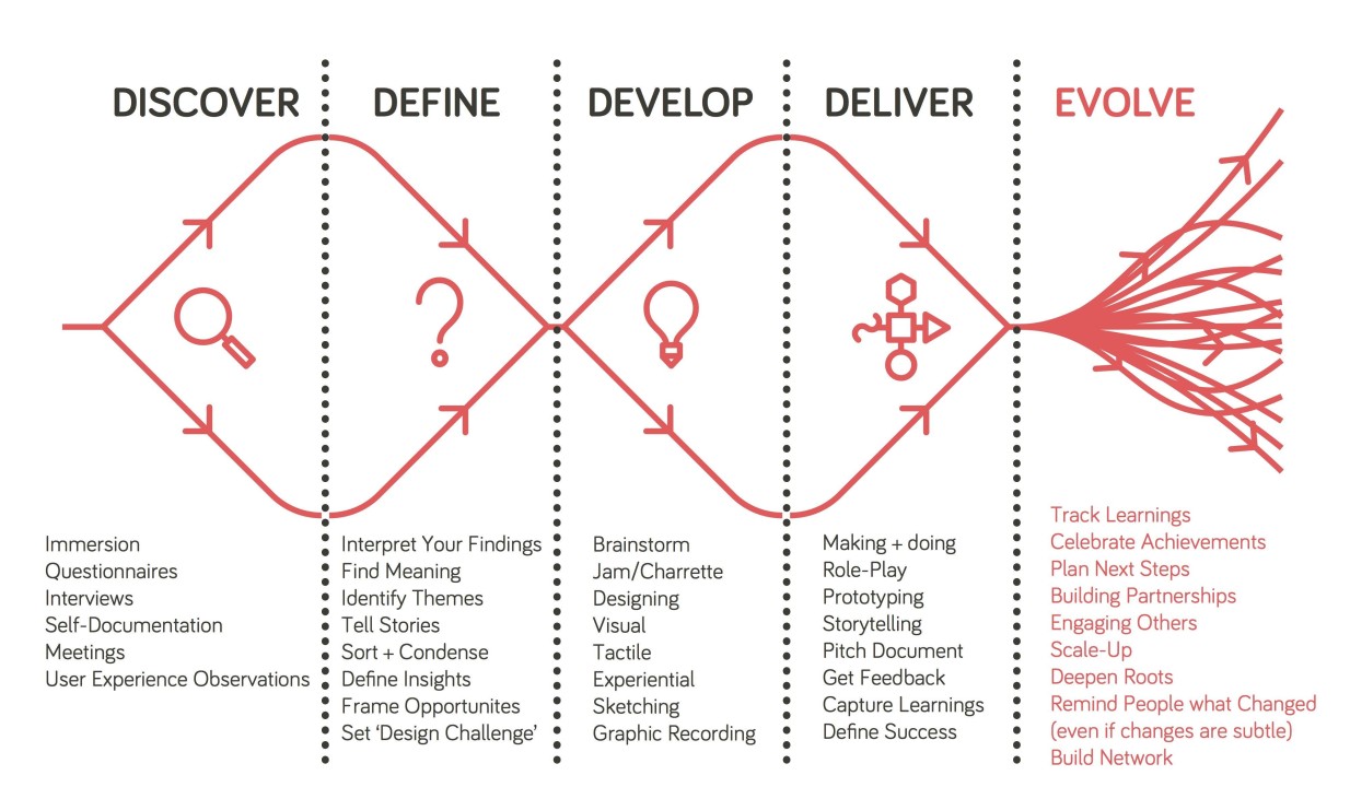 자인 사고(Design Thinking)와 사용자 중심 디자인(User-Centered Design)을 위한 프레임워크로 문제 해결 과정을 체계적으로 다루며, 주로 네 단계로 구성된다.