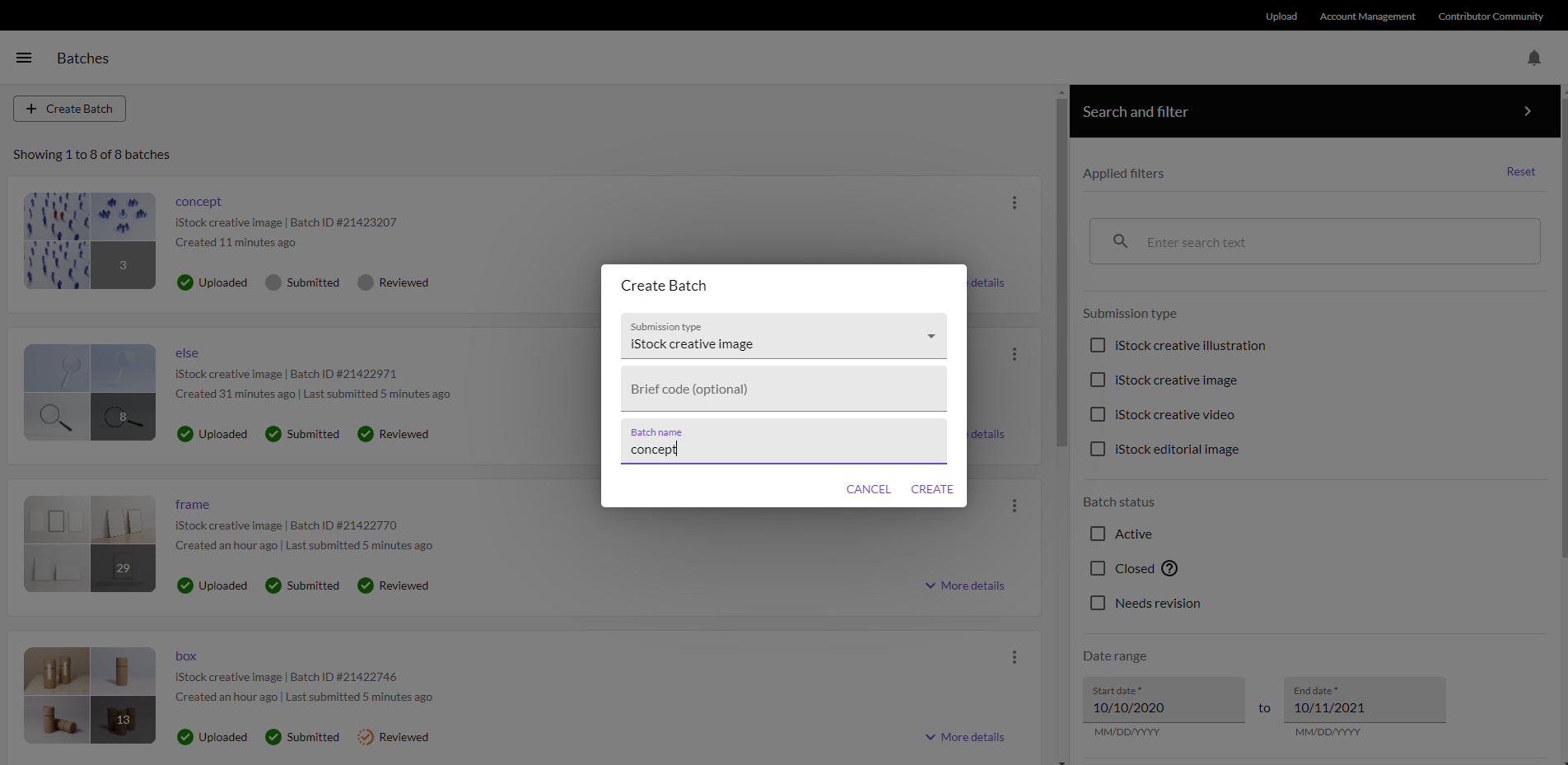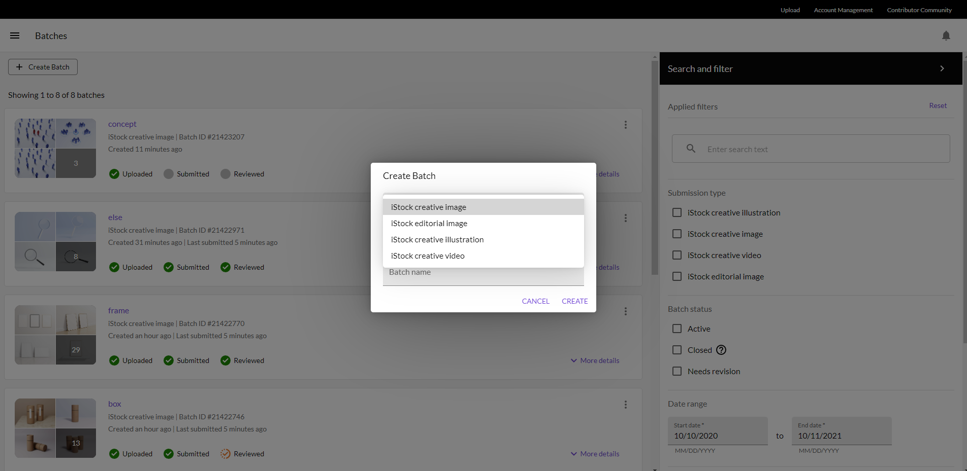 Submission type과 Batch name만 기입하고 create를 선택해주면 된다.