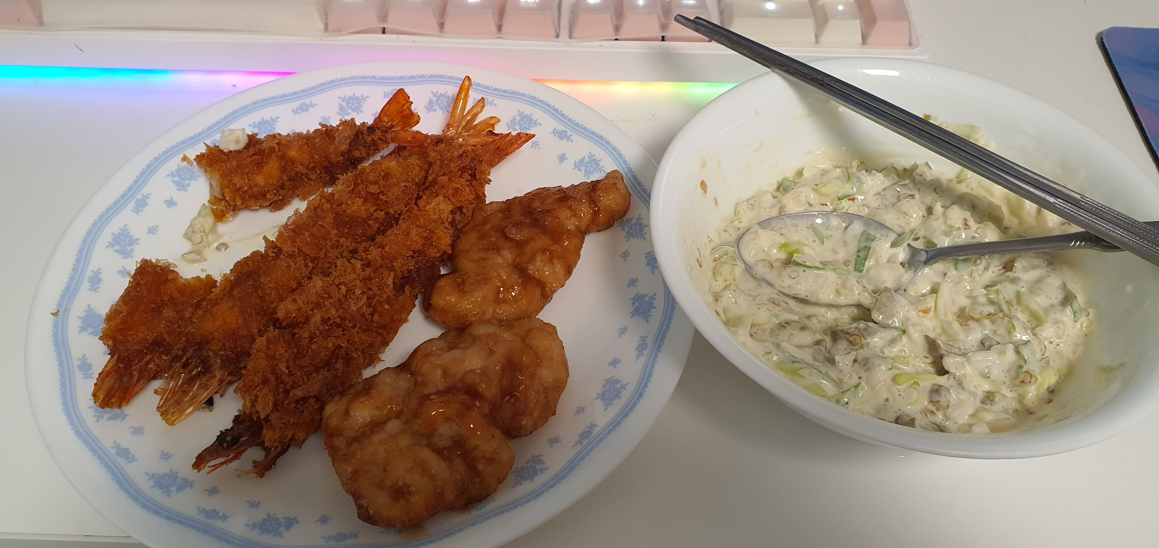 - 집에 새우튀김이 있어서 찍어먹을 소스를 고민하다가 타르타르소르를 만들었다. 유튜브에서 검색해보았는데 재료가 다 있지는 않아서 그냥 냉장고에 있는 재료를 이것저것 꺼내어 만들었다. 뭐 그럭저럭 먹을만 했다.