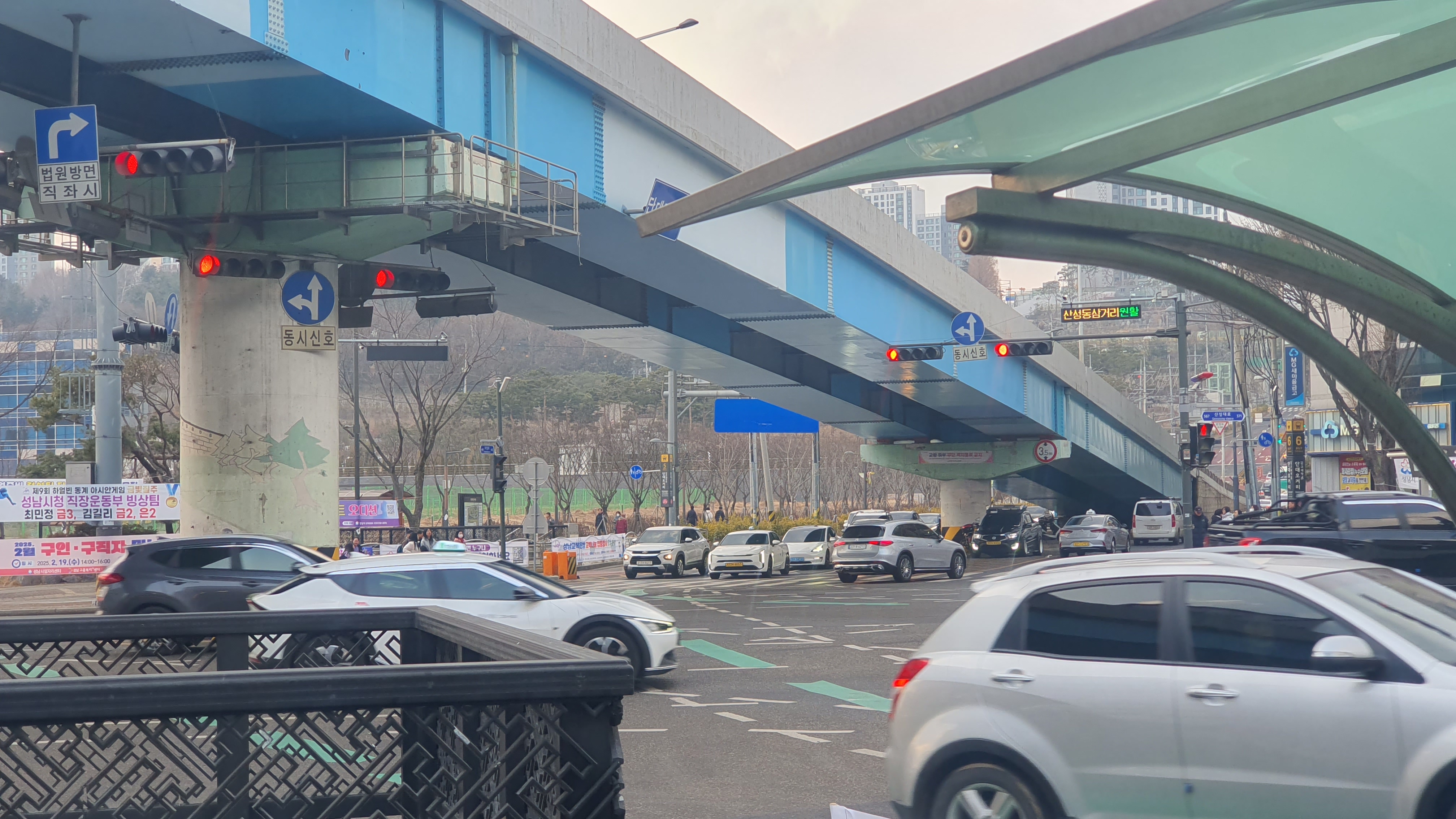 도로 위, 신호등이 붉은빛으로 점멸하며 잠시 속도를 멈춘다. 차들의 유리창에는 흐릿한 도시의 반사가 겹쳐지고, 신호를 기다리는 차량들은 도로 위의 질서를 따라 일렬로 정렬된다. 머리 위로 길게 뻗은 푸른 육고가 공중을 가로지르며, 그 아래로 복잡한 움직임들이 교차한다. 저마다의 목적지를 향해 가는 자동차들, 그리고 보행자들의 조용한 흐름이 겹쳐져 도시는 오늘도 살아 숨쉰다.