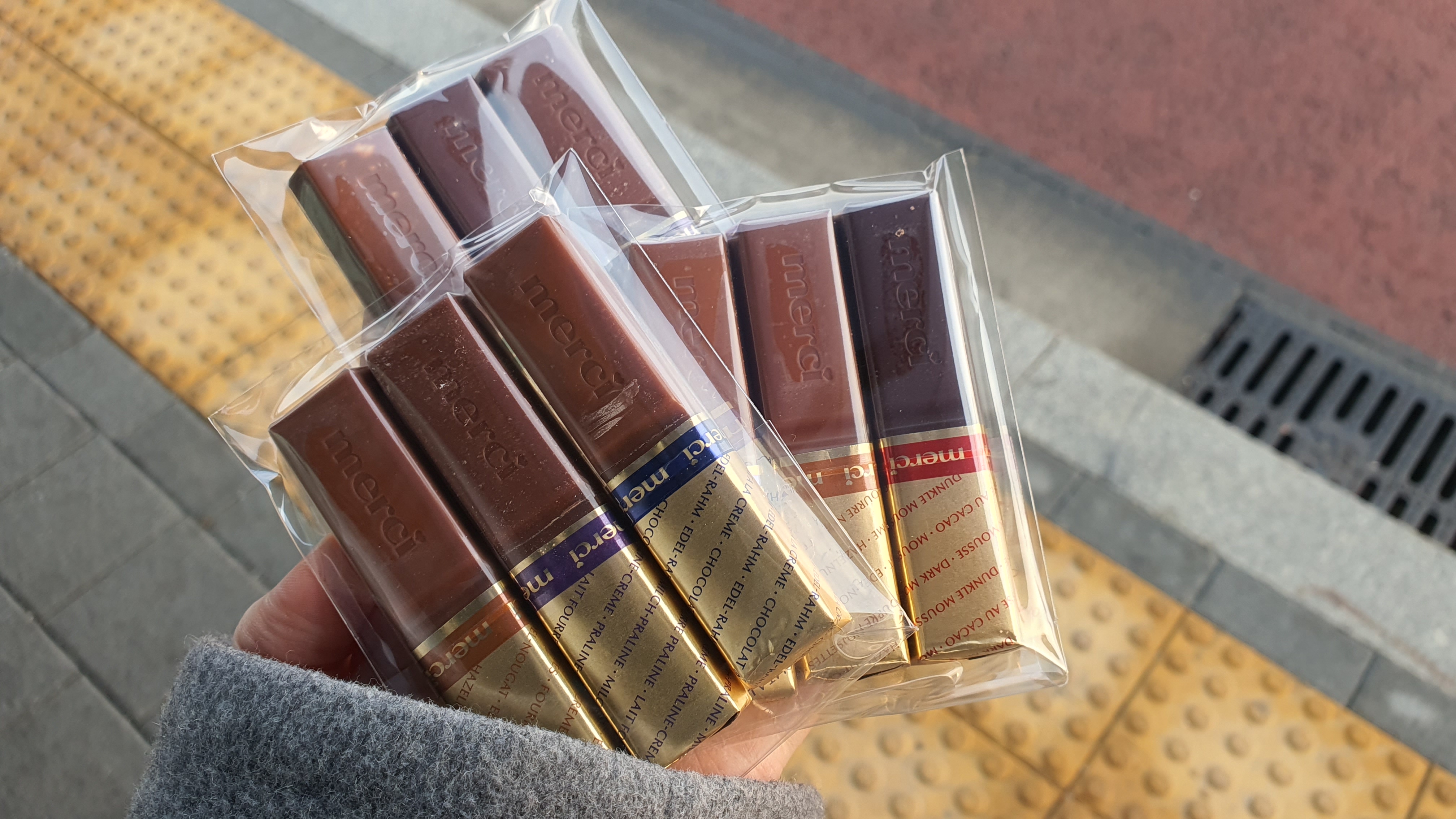 - 아침에 빠르게 초콜릿을 포장하던 시간. 포장지가 너무 잘 풀어져서 어떻게 가져갈까 고민했는데 비닐봉투를 발견해서 생각보다 딱 맞고 예쁘게 포장되었다. 초콜릿 갯수도 거의 딱 맞았다.