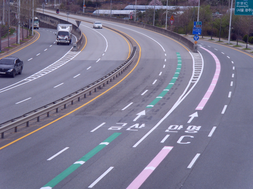 - 분홍색 (우측 차로)와 연한 녹색(좌측 차로)을 사용하여 시각적 구별을 용이하게 함.