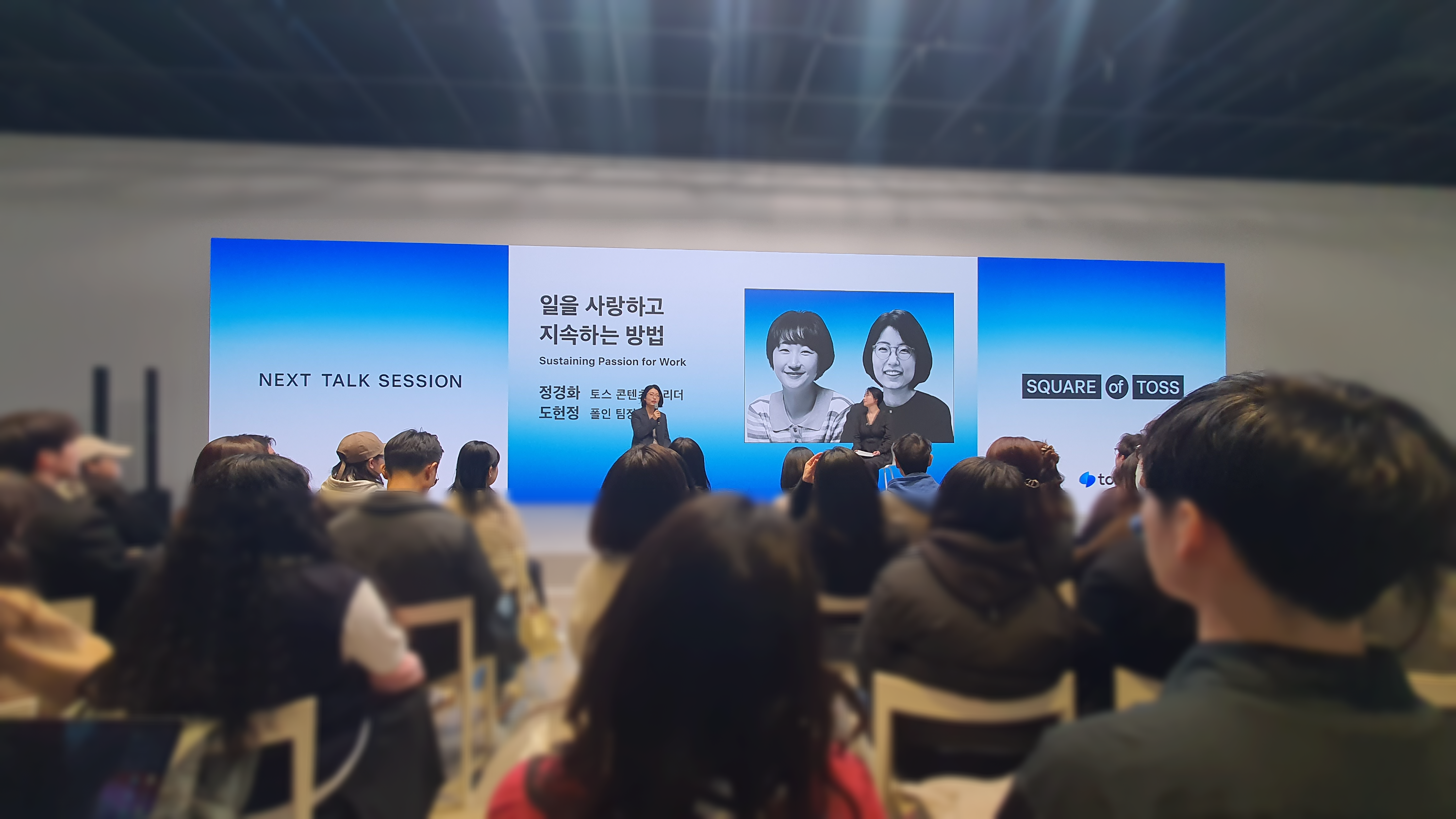 넥스트 세션의 첫 번째는 일을 사랑하고 지속하는 방법이다. 정경화님은 토스의 문화, 토스가 일하는 방식을 <유난한 도전>이라는 책으로 발간했다고 했다. 인상적이었던 것은 책을 쓰면서 회사에서는 다른 일을 하지 말고 이것에만 몰입할 수 있도록 만들어주었다는 것. 어떻게든 많은 일을 시키는 것이 아니라 직원의 관심사와 그 관심사를 회사의 성장과 고도화로 이끌 수 있도록 환경을 유지해주고 있다는 생각이 들었다.